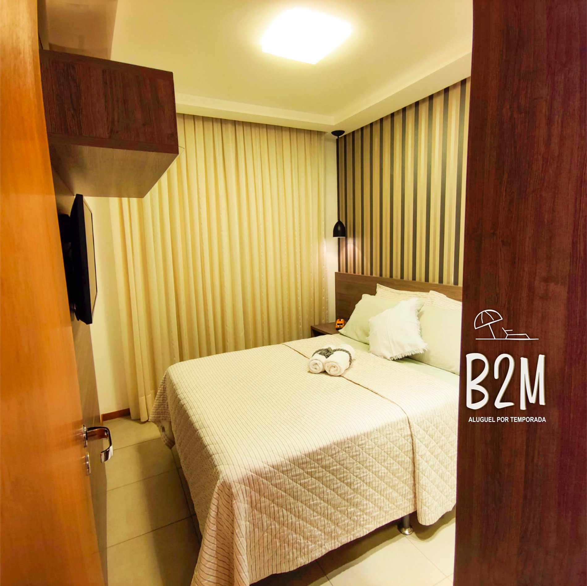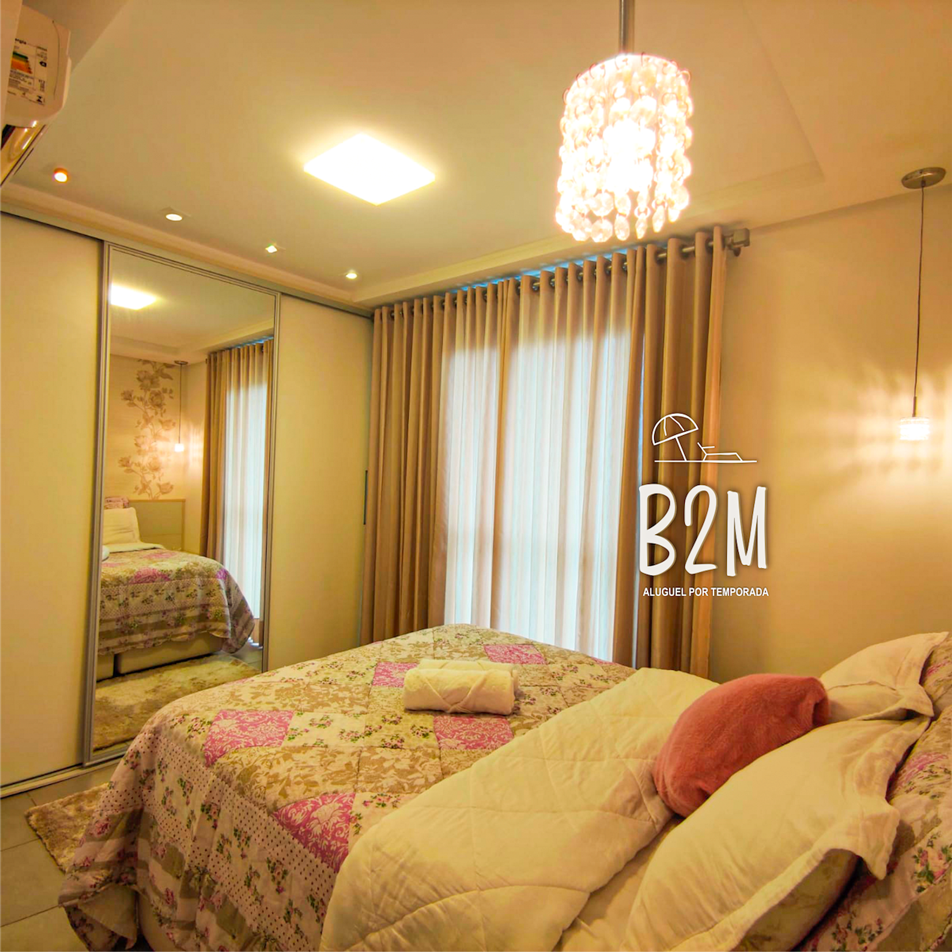 1 cama de casal, ar condicionado, televisão, luz para leitura, criado mudo, cortina com blackout, decoração aconchegante, armário