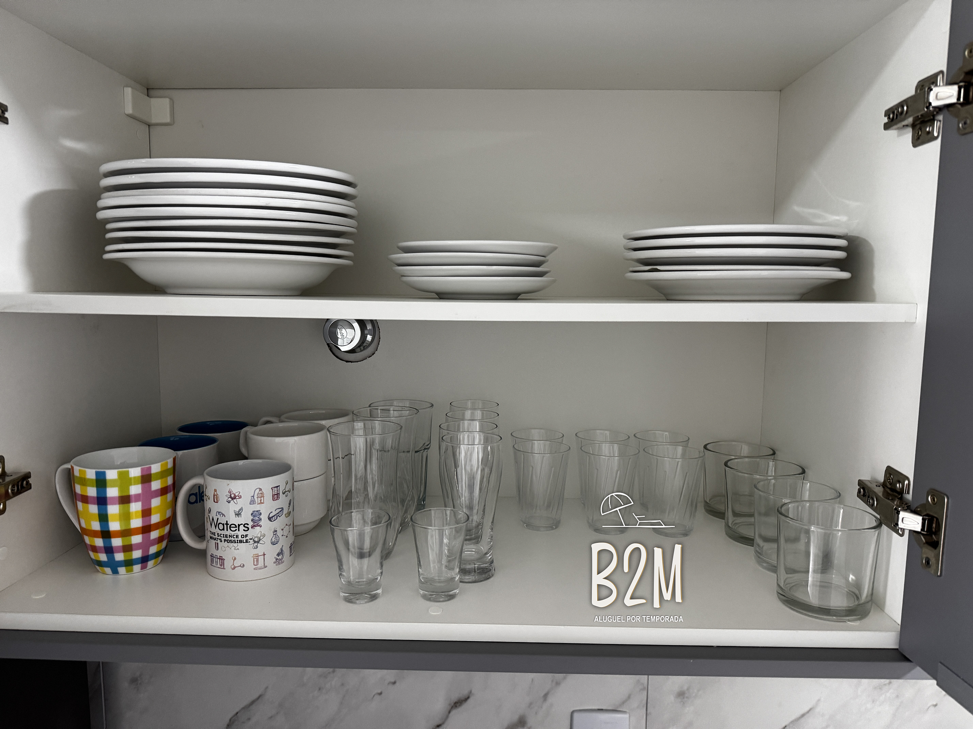 geladeira duplex, microondas, fogão, cafeteira, liquidificador, panelas, talheres e utensílios para o preparado de deliciosas refeições