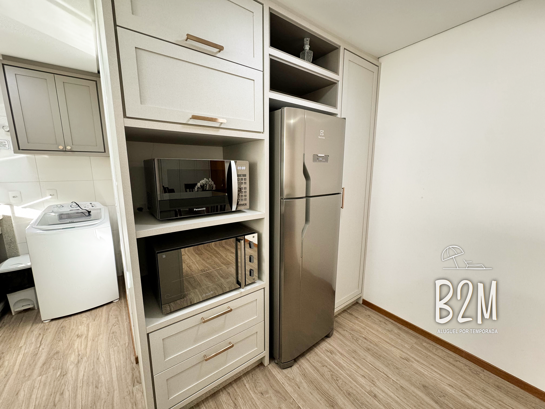 geladeira duplex, microondas, fogão, forno elétrico, liquidificador, cafeteira elétrica, panelas, talheres e utensílios para o preparado de refeições.