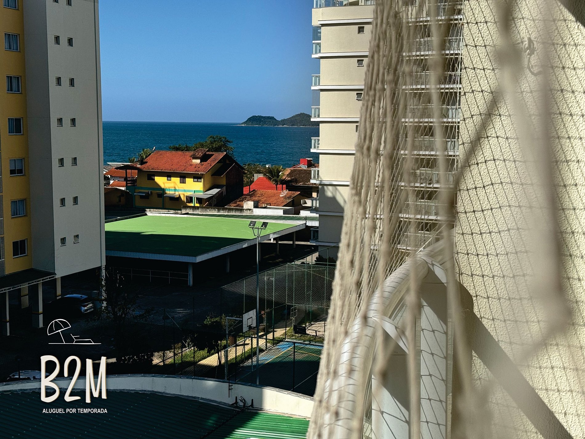 varanda com tela de proteção e vista do mar, 1 cama queen, ar condicionado, televisão, armário, banheiro privativo
