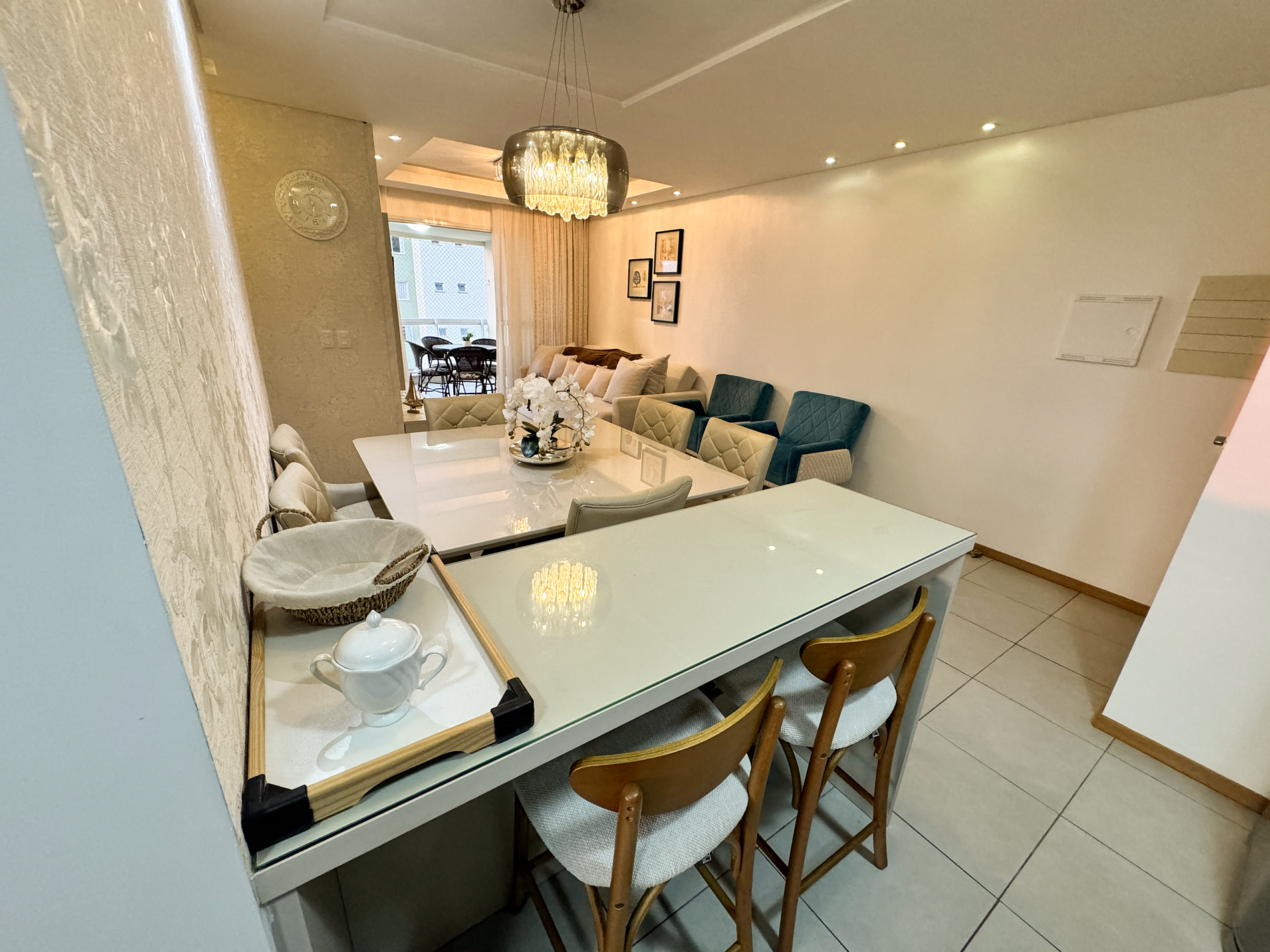 sofá, 2 poltronas, televisão, internet wifi, mesa de jantar para 6 pessoas, decoração elegante