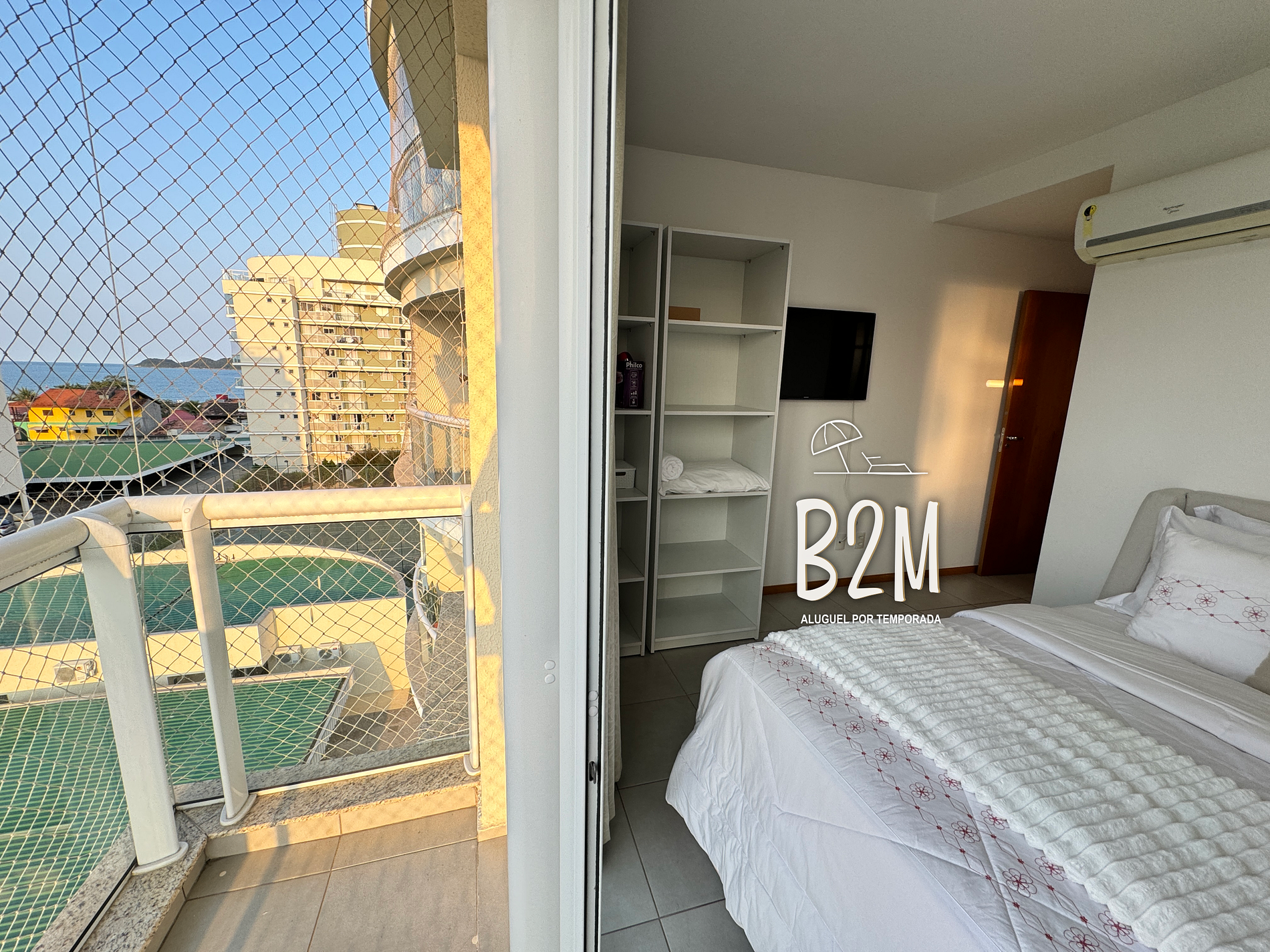 varanda com tela de proteção e vista do mar, 1 cama queen, ar condicionado, televisão, armário, banheiro privativo