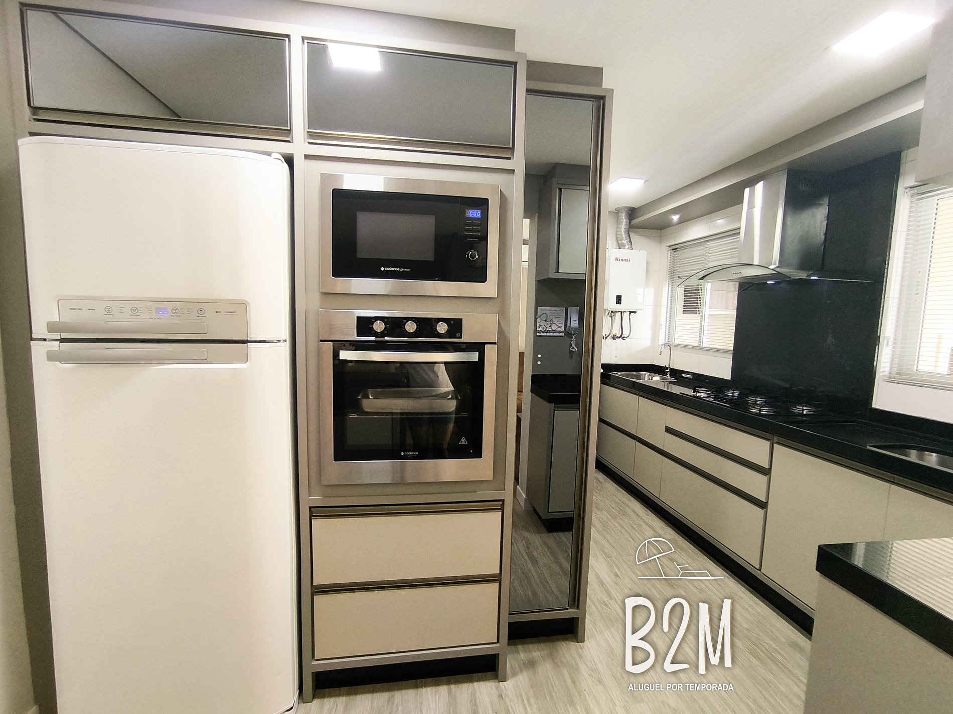 geladeira duplex, microondas, fogão, forno elétrico, liquidificador, cafeteira elétrica, panelas, talheres e utensílios para o preparado de refeições.