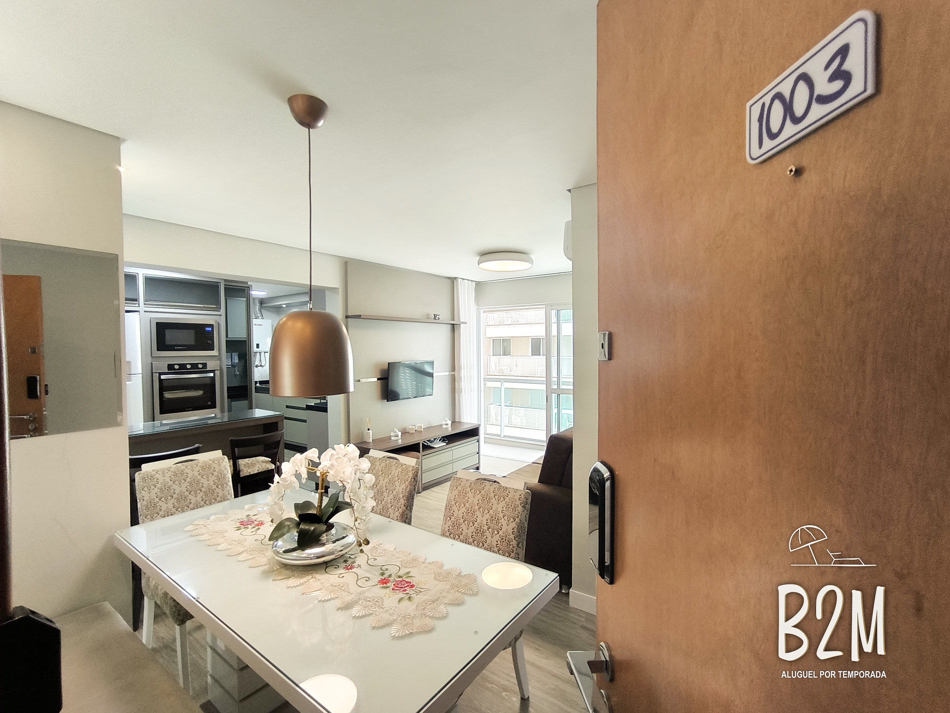 O apartamento possui 2 quartos, sendo 1 suíte. Cozinha completa e uma varanda com churrasqueira e vista para o mar