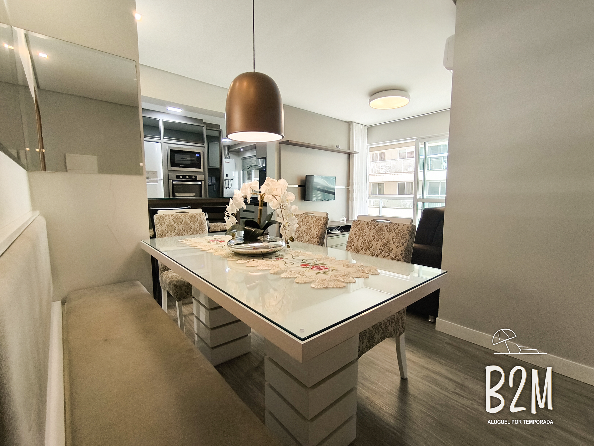 sofá, estante, smarttv, tvbox, ar condicionado, mesa de jantar para 6 pessoas