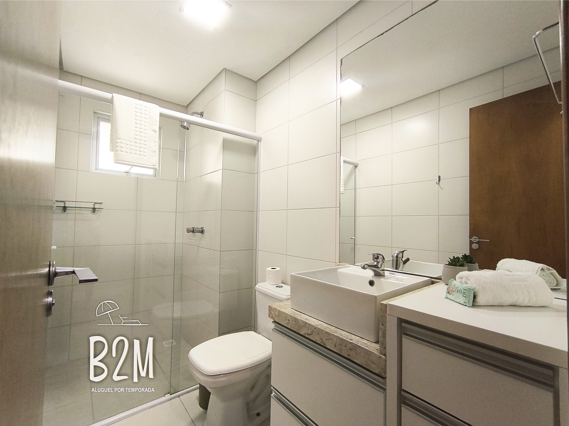 O apartamento possui 2 quartos, sendo 1 suíte. Cozinha completa e uma varanda com churrasqueira e vista para o mar