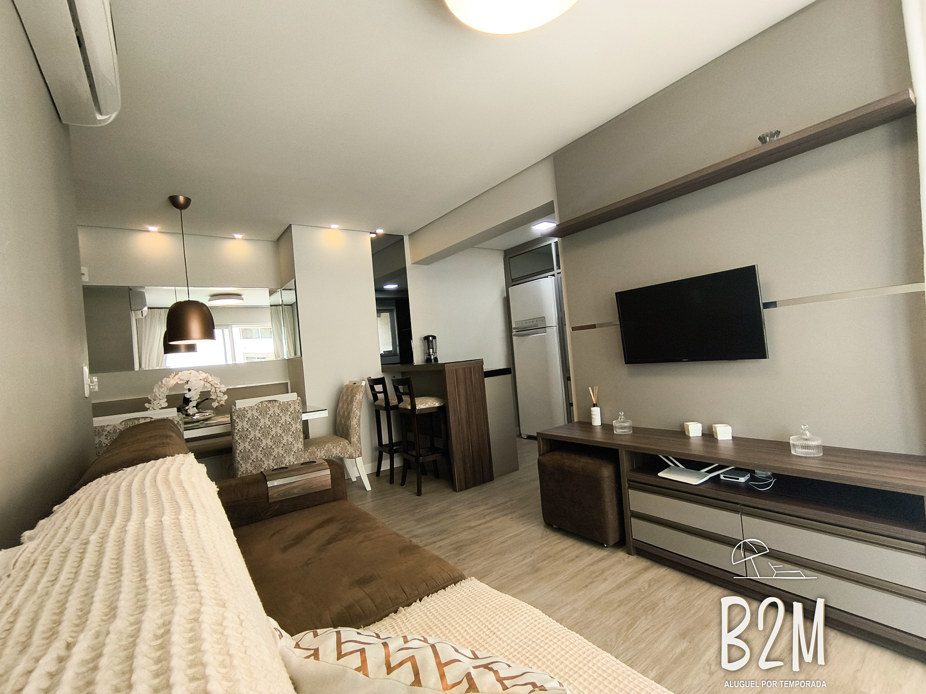 sofá, estante, smarttv, tvbox, ar condicionado, mesa de jantar para 6 pessoas