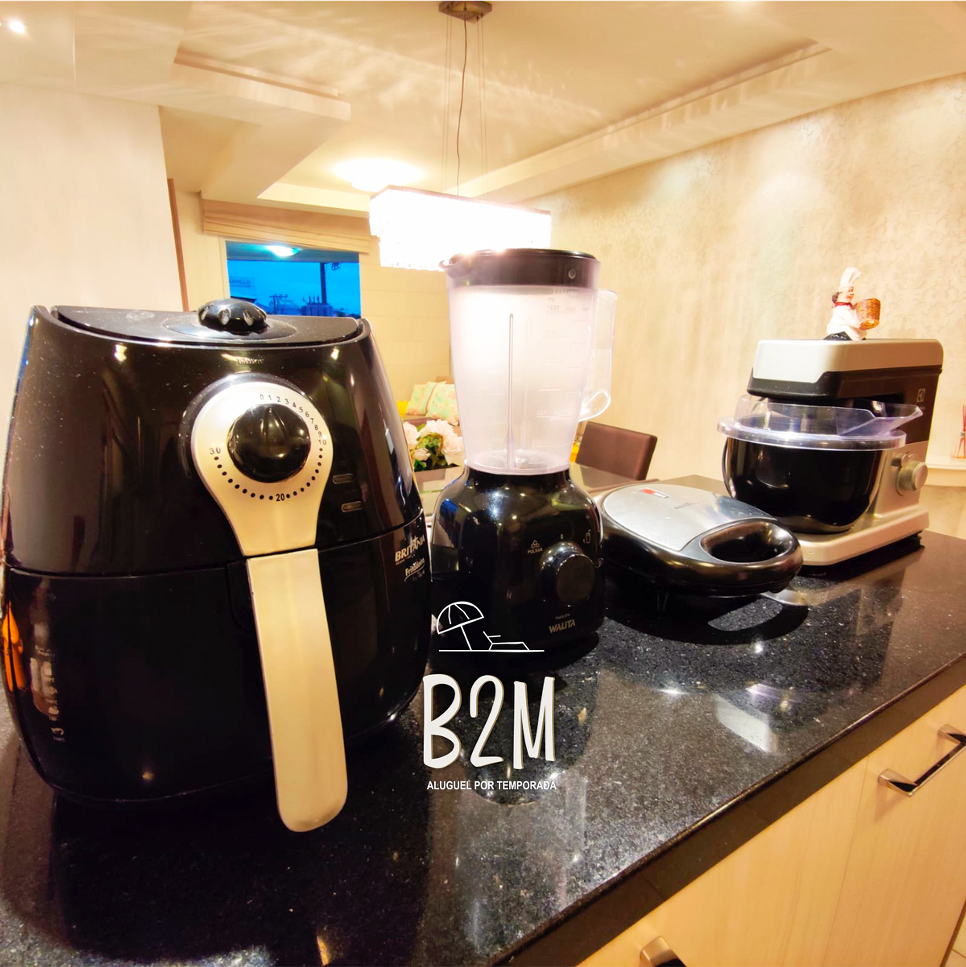 geladeira, microondas, fogão, forno elétrico, liquidificador, sanduicheira, batedeira, air fryer, bebedouro, panelas, talheres e utensílios para o preparado de refeições.