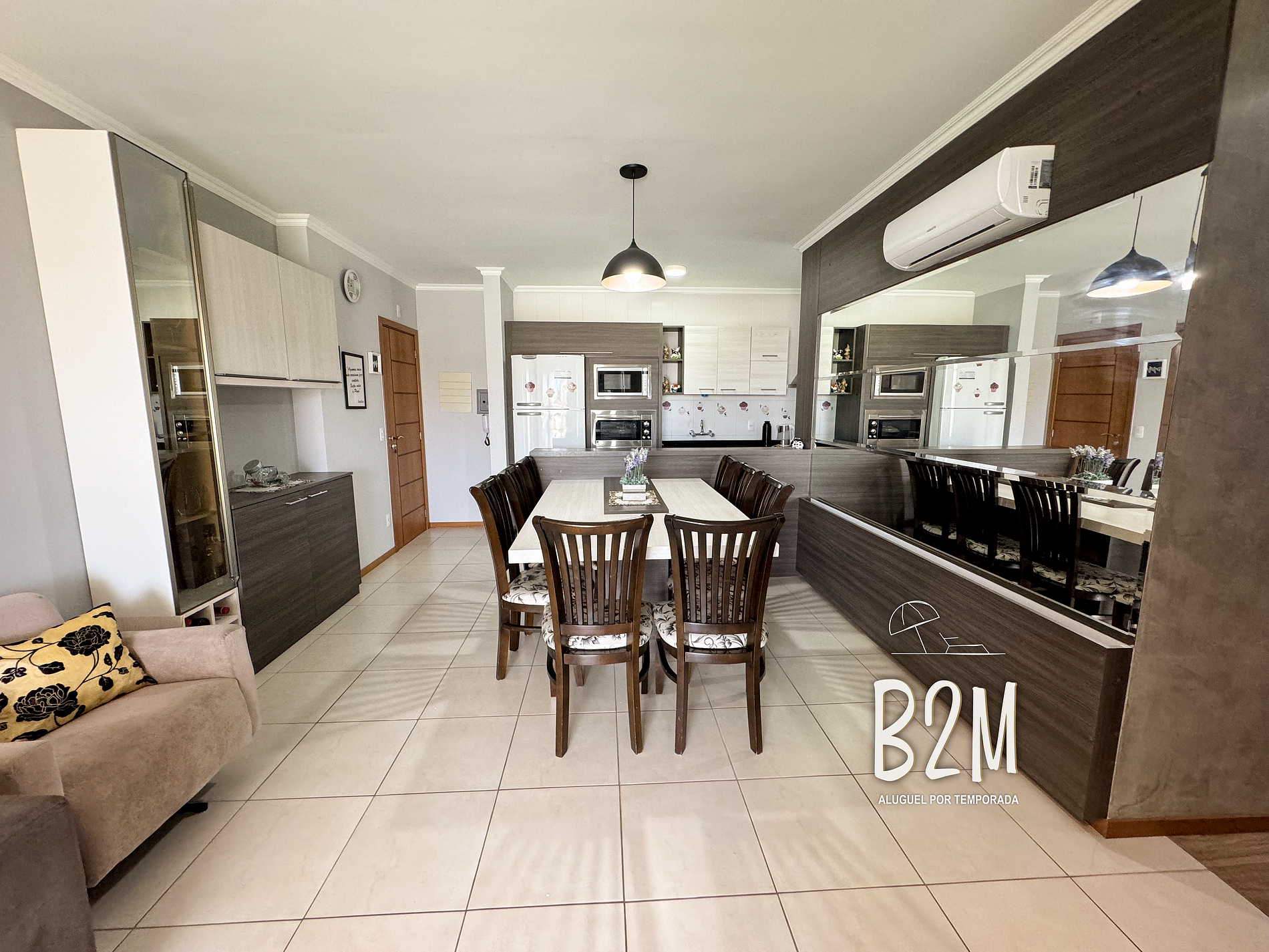 sofá retrátil, poltrona, televisão, internet wifi, ar condicionado, mesa de jantar para 8 pessoas, buffet com taças
