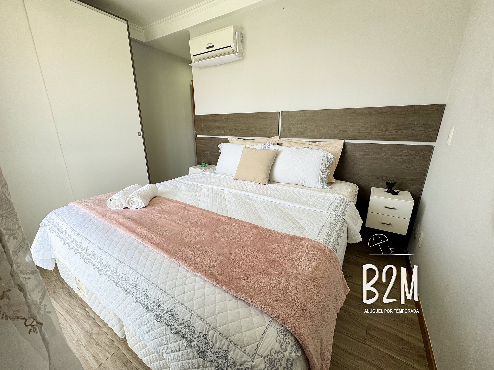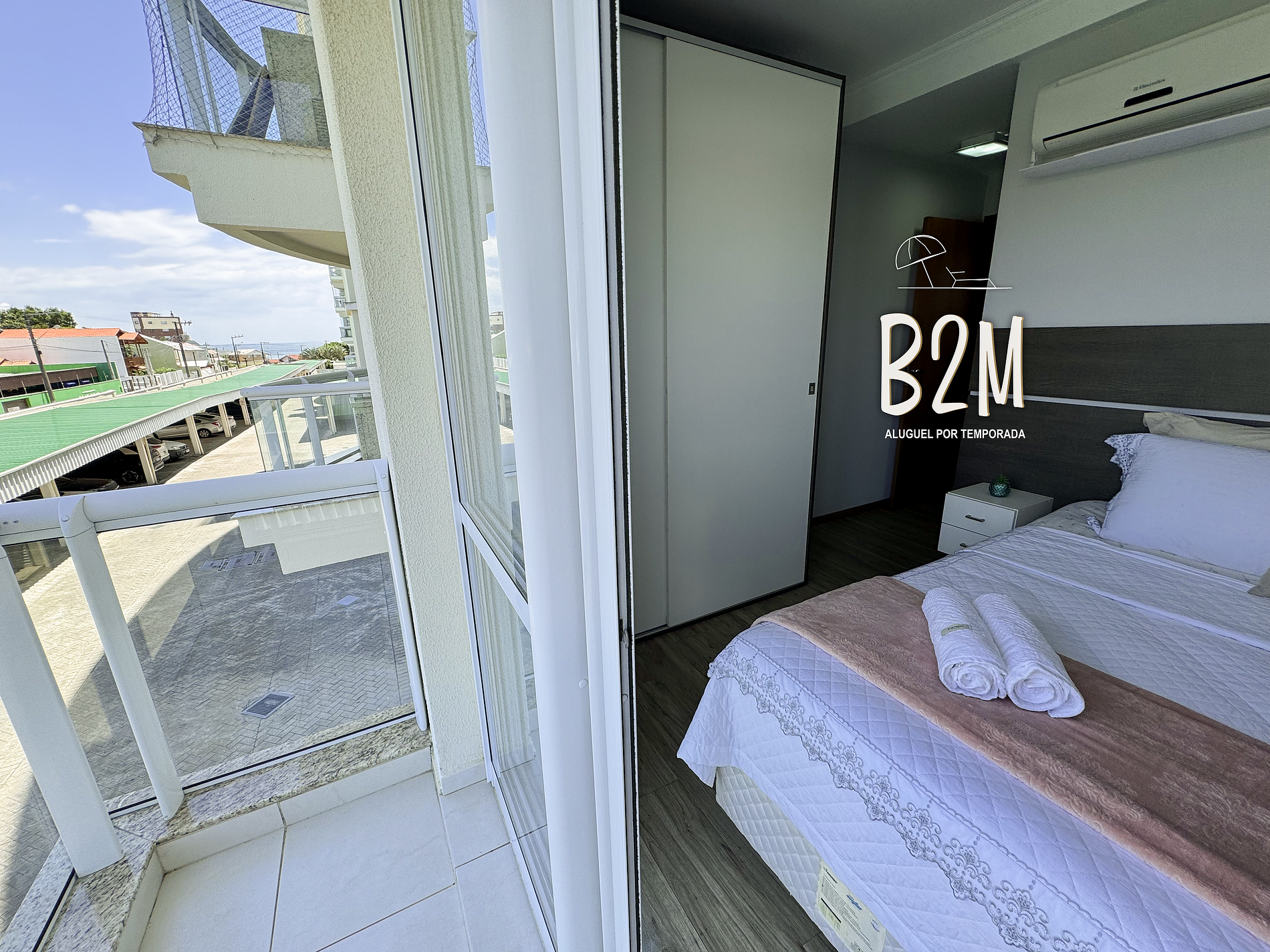 varanda com vista do mar, 1 cama queen, televisão, ar condicionado, criado mudo, cortina, armário, piso laminado, banheiro privativo com água aquecida a gás