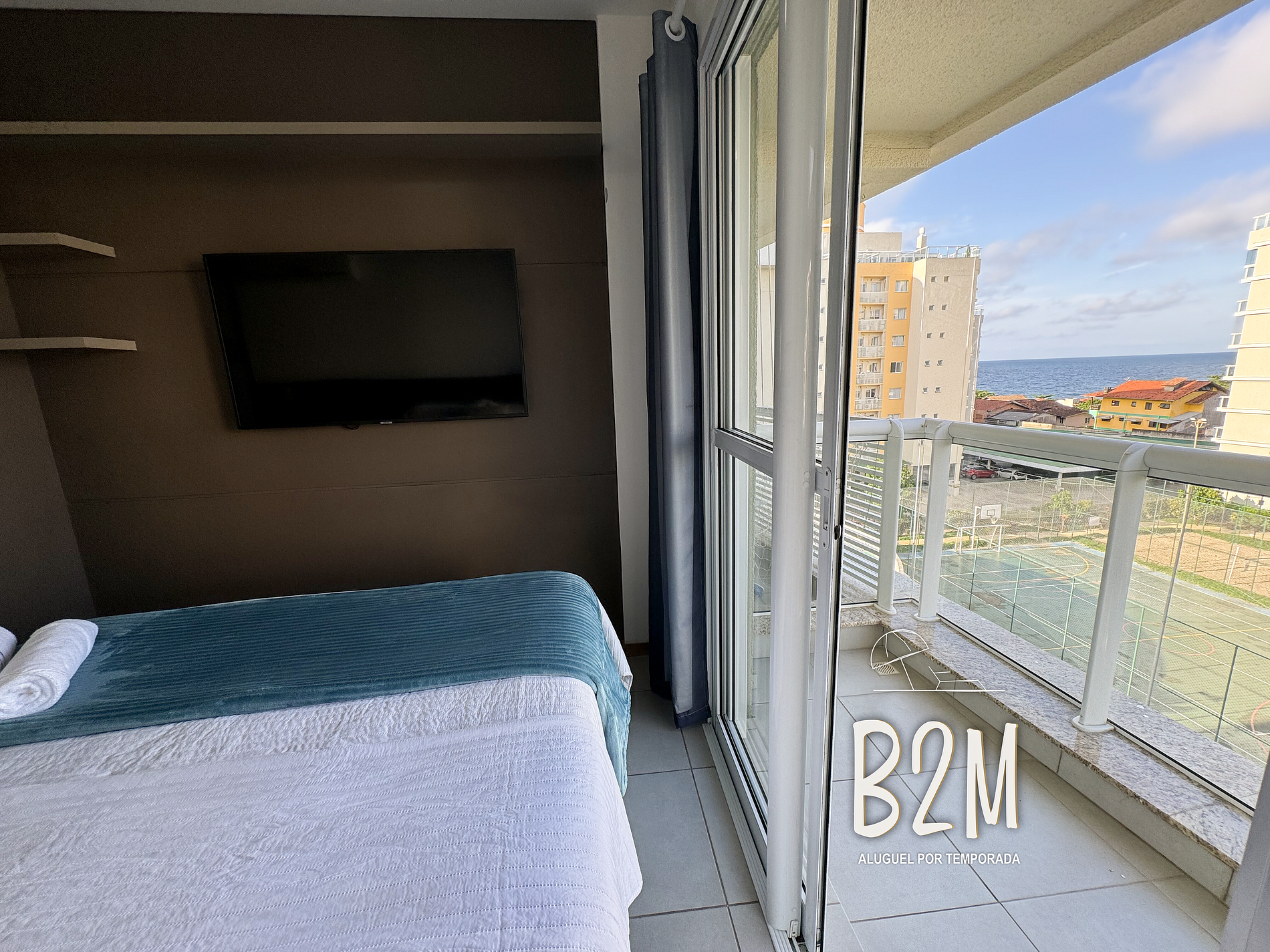 Apartamento muito bem iluminado com vista para o mar, para quadra poliesportiva e para a piscina.