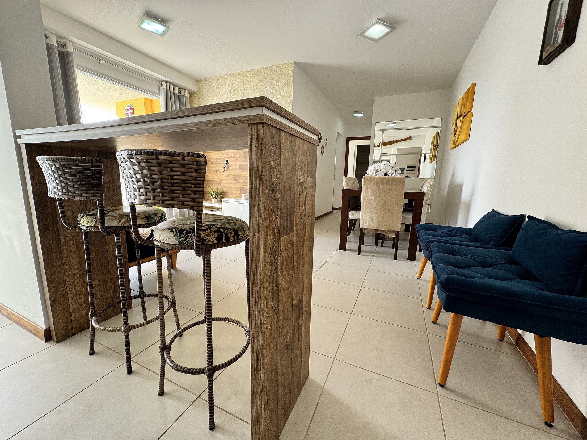 sofá, 2 poltronas, televisão, internet wifi, ar condicionado, mesa de jantar para 6 pessoas