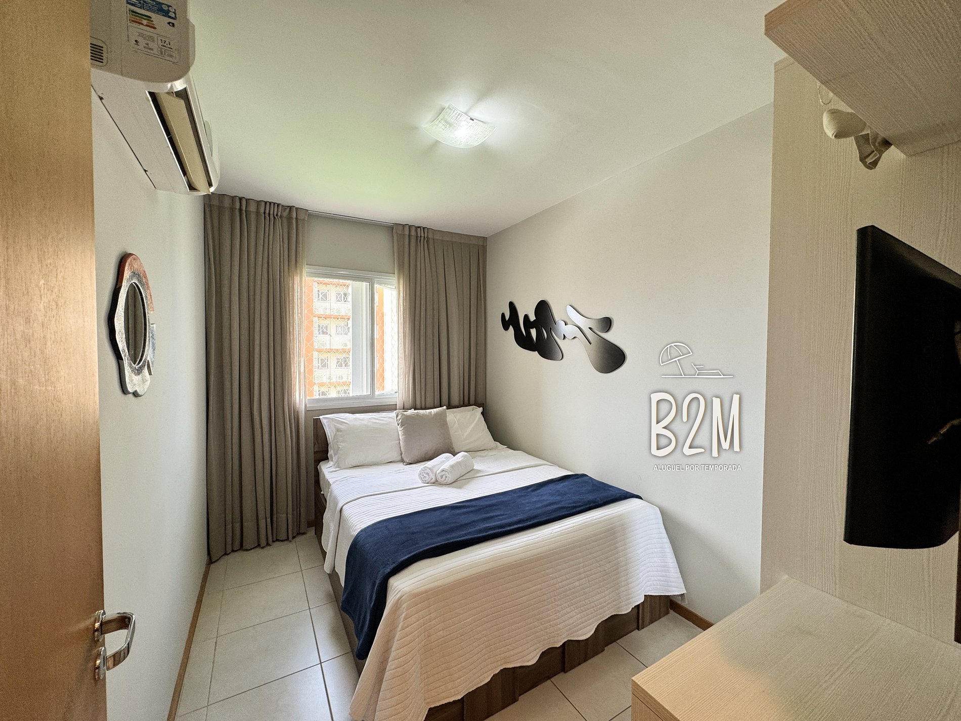 1 cama de queen, 1 cama de solteiro, ar condicionado, televisão, armário