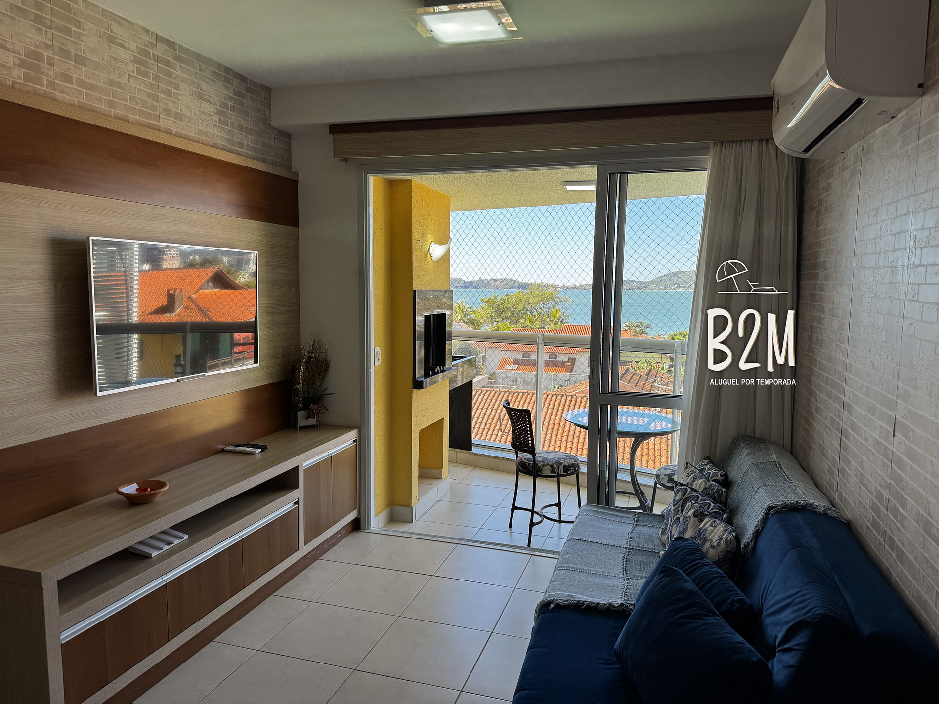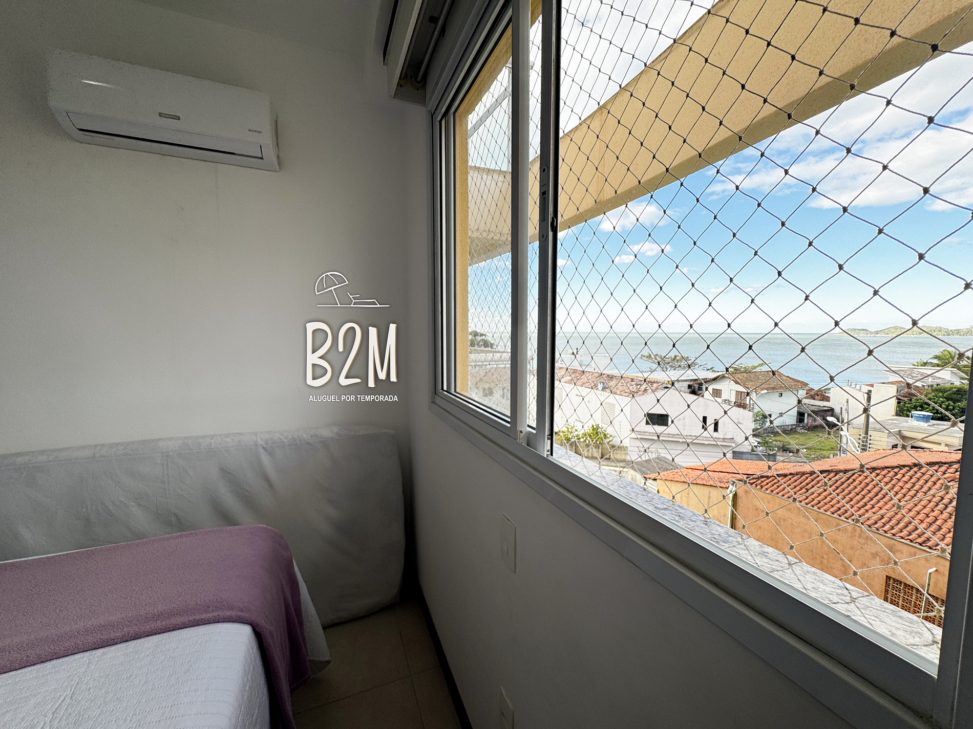 varanda com vista para o mar, cama de casal, televisão, ar condicionado, cortina com blackout, armário, banheiro privativo com chuveiro aquecido a gás