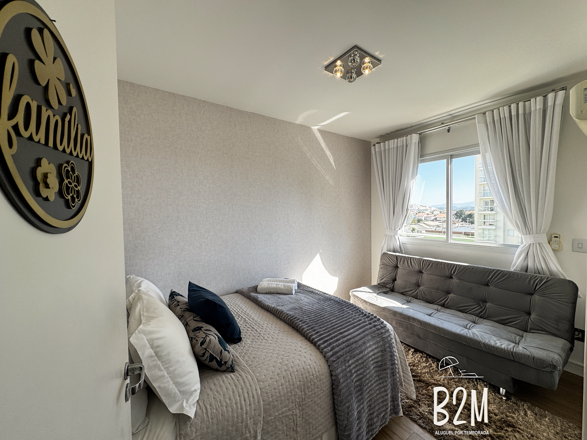 janela com vista da piscina, cama de casal, sofá cama, ar condicionado