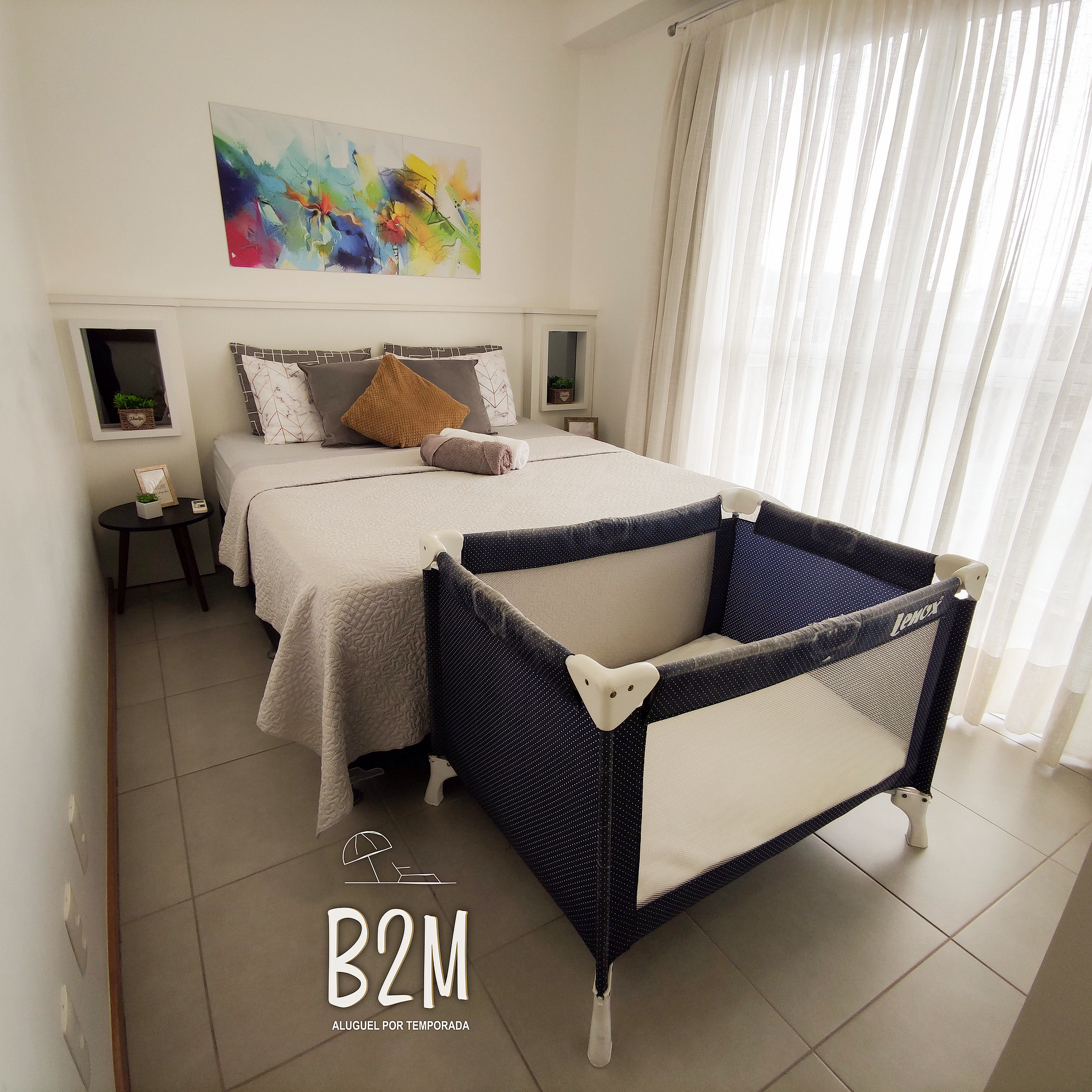 1 cama casal, ar condicionado, cômoda, berço portátil, cortina com blackout