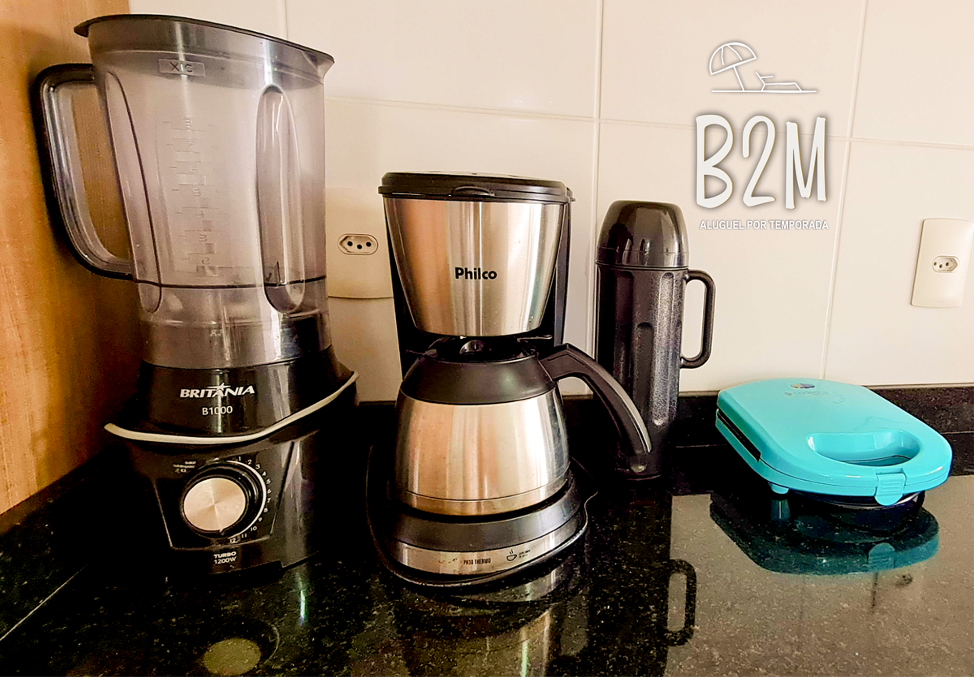 geladeira, microondas, fogão, sanduicheira, cafeteira, liquidificador, panelas, talheres e utensílios para o preparado de refeições.