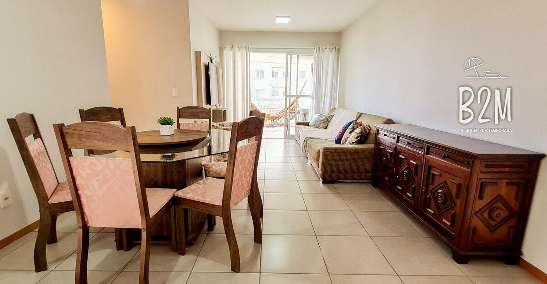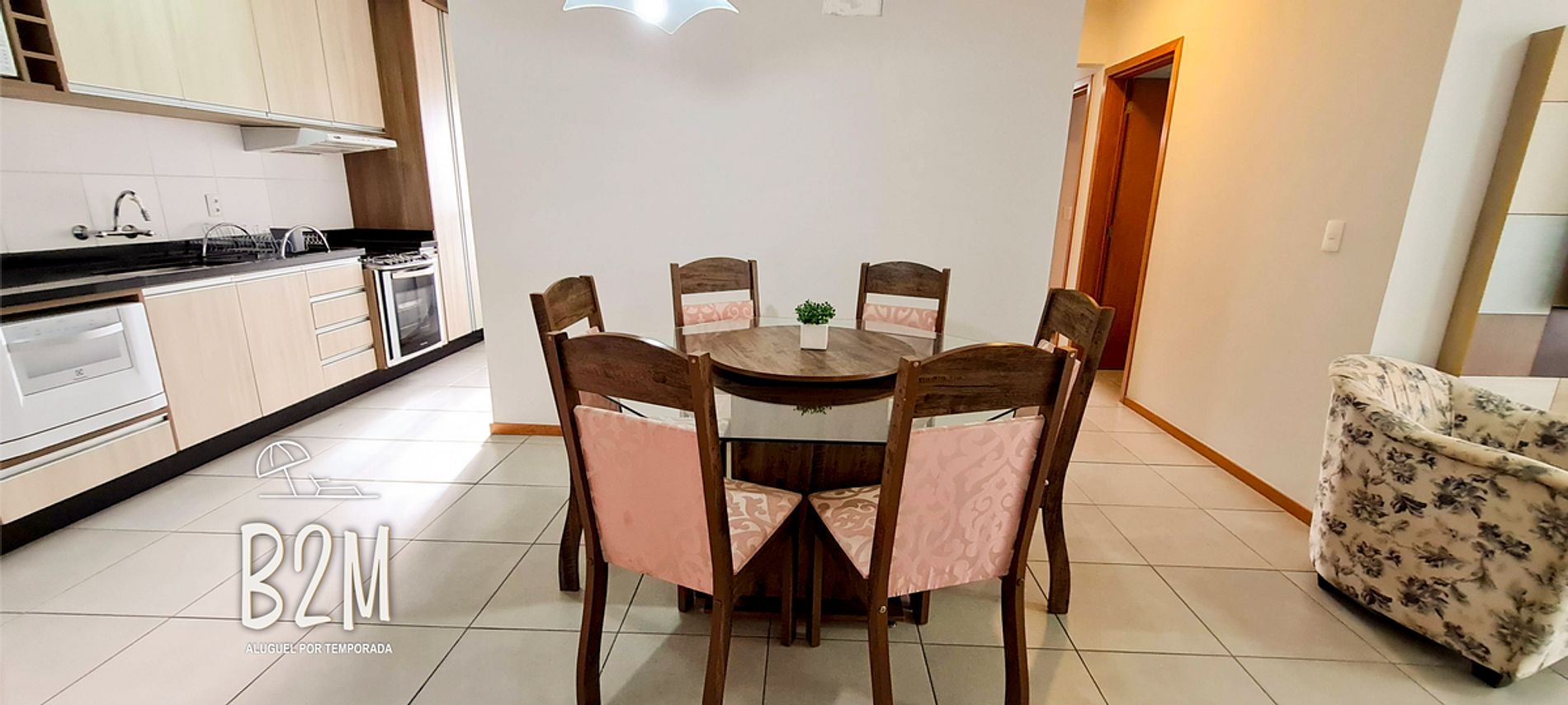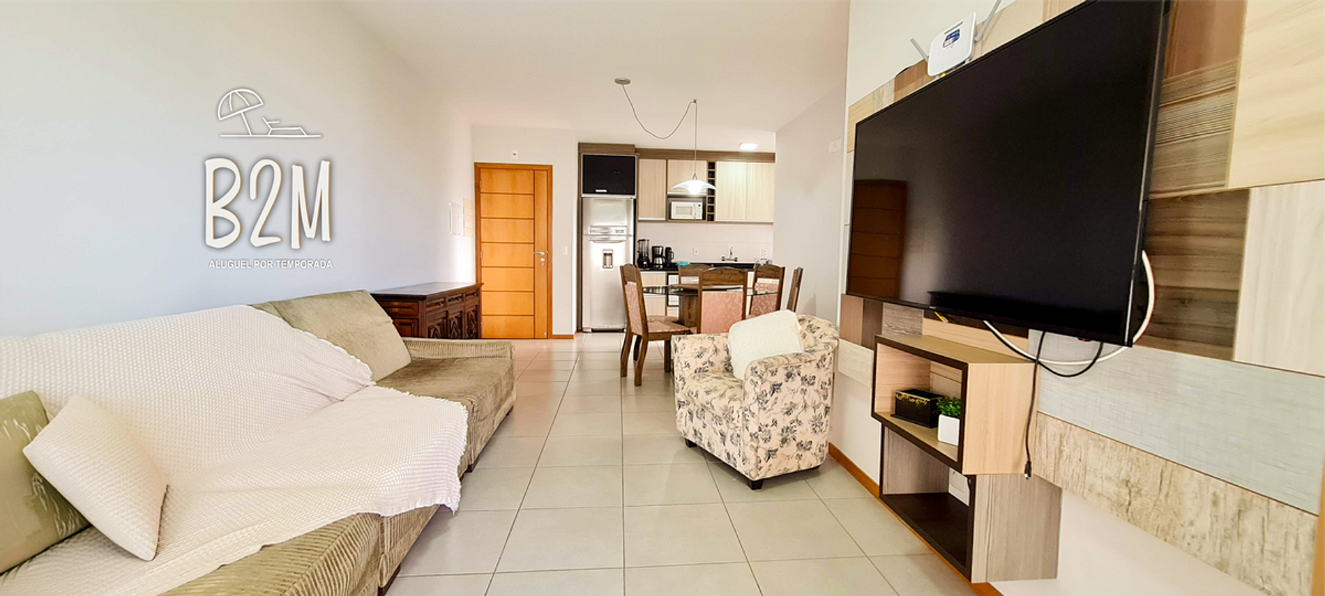 sofá retrátil, poltrona, televisão, internet wifi, mesa de jantar para 6 pessoas