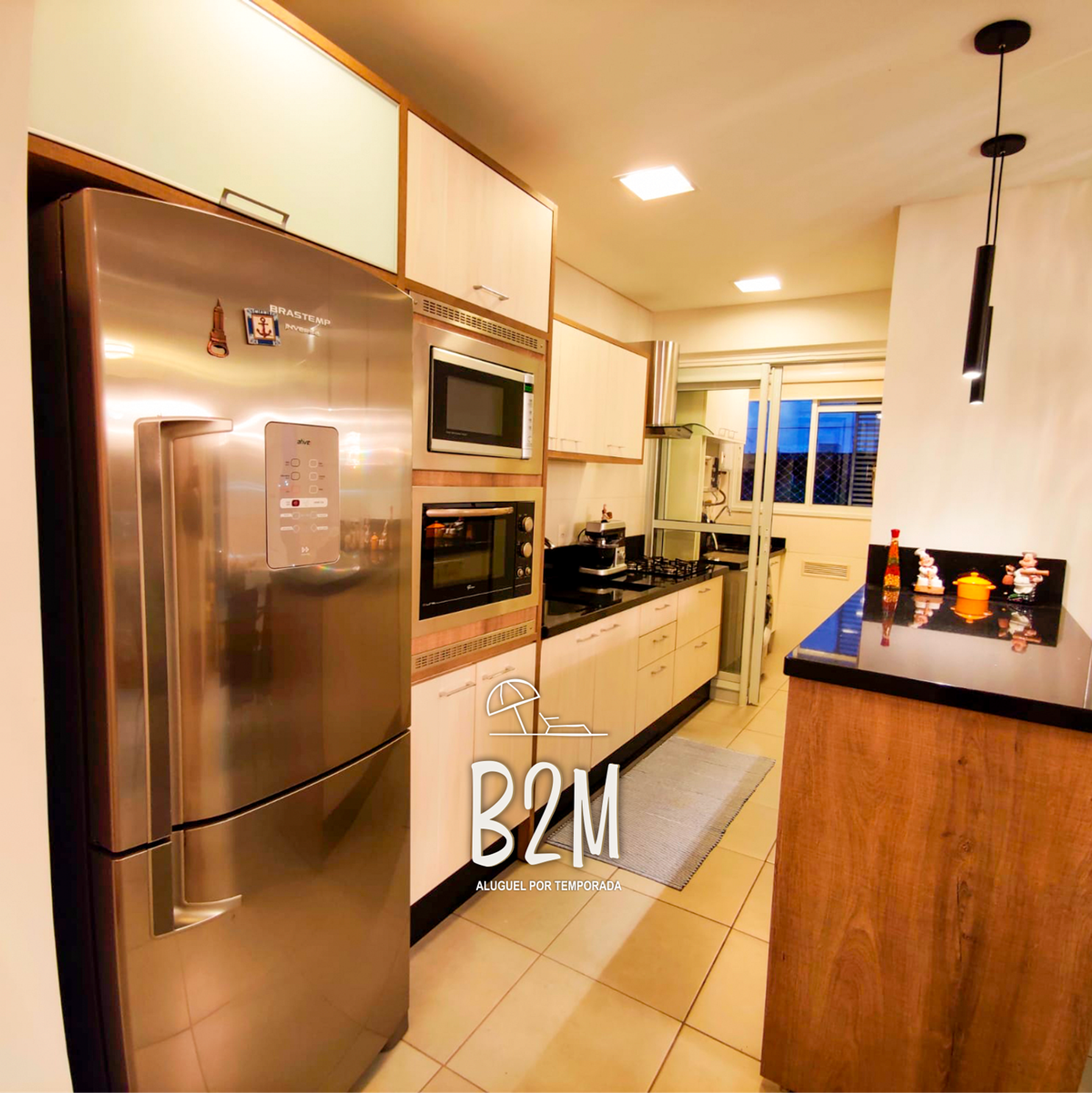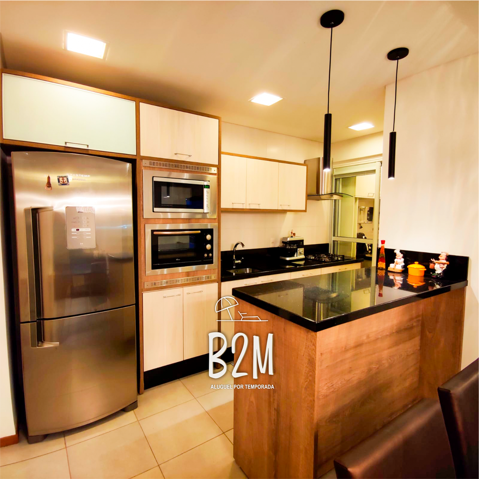 geladeira, microondas, fogão, forno elétrico, liquidificador, sanduicheira, batedeira, air fryer, bebedouro, panelas, talheres e utensílios para o preparado de refeições.