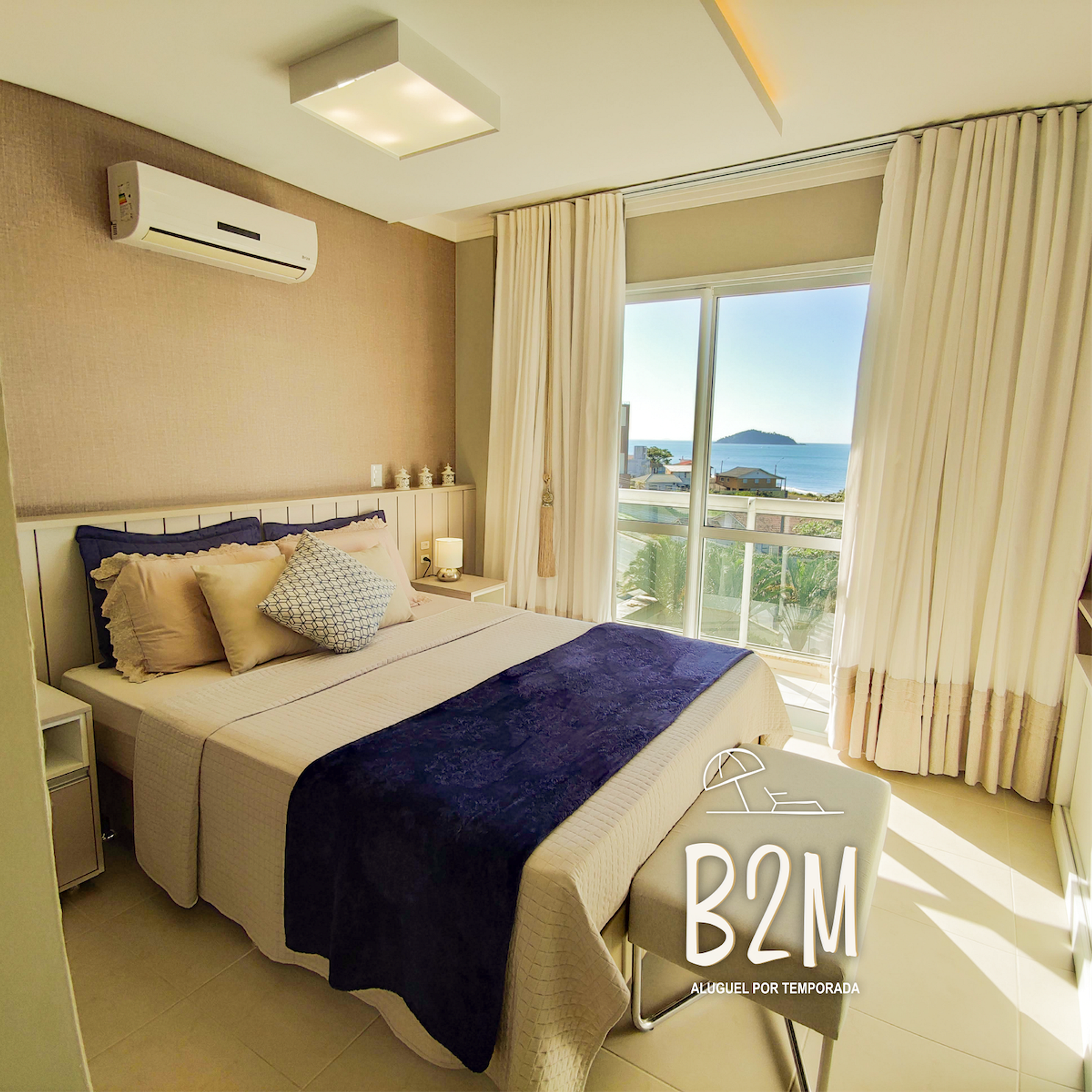 varanda goumet com vista do mar, cama queen, televisão, ar condicionado, armário, banheiro privativo com água quente