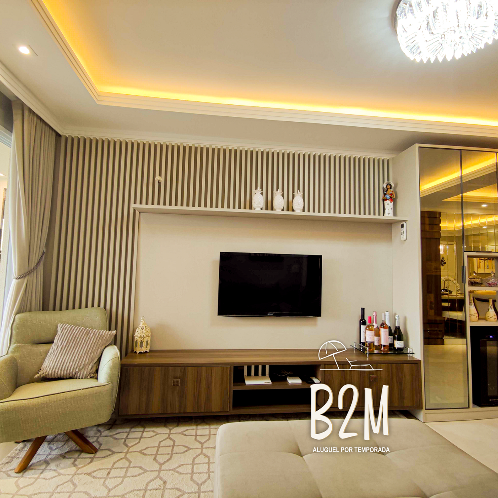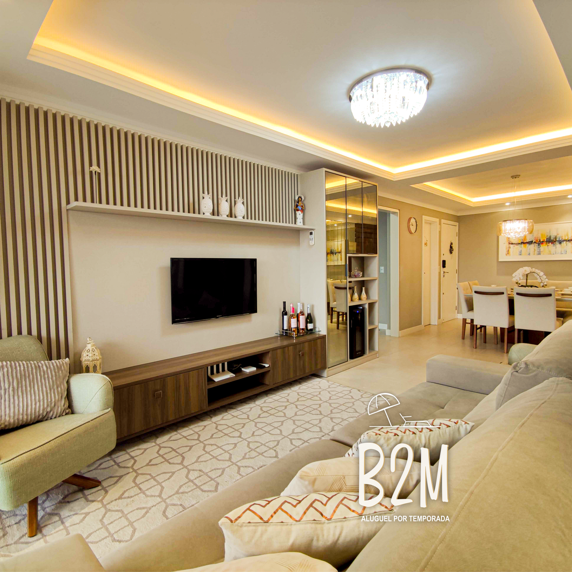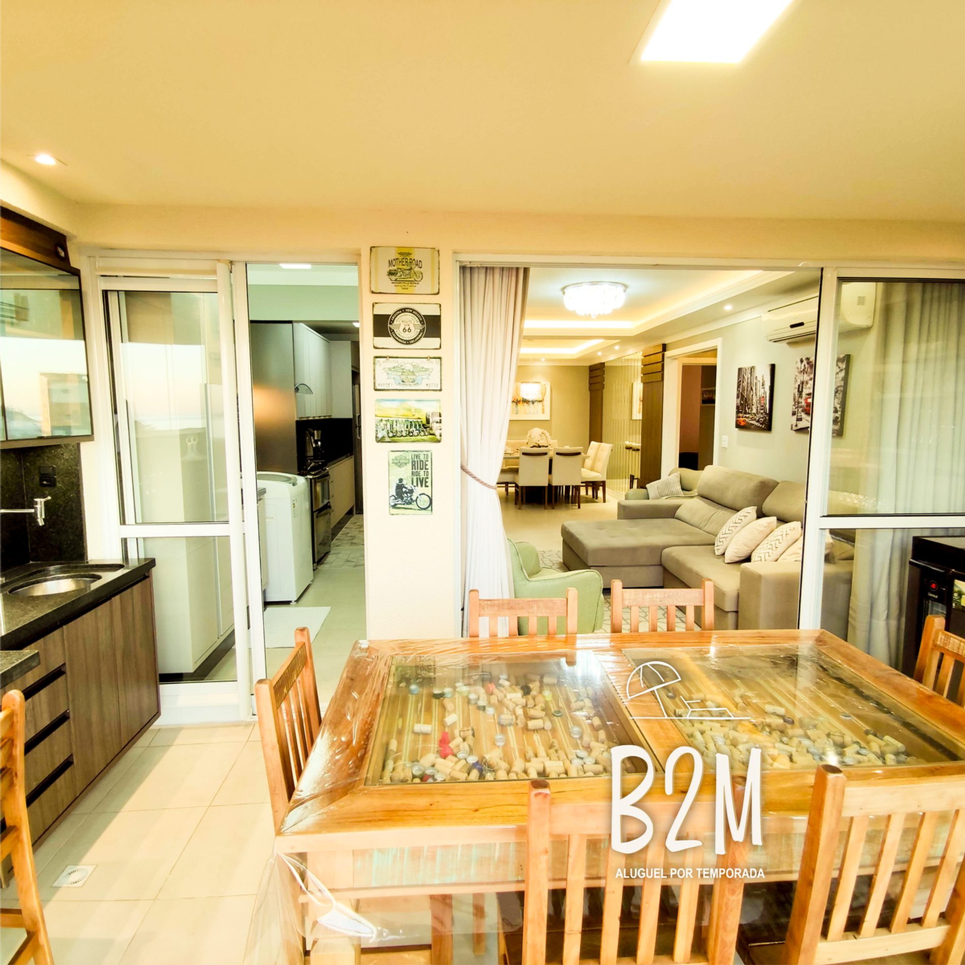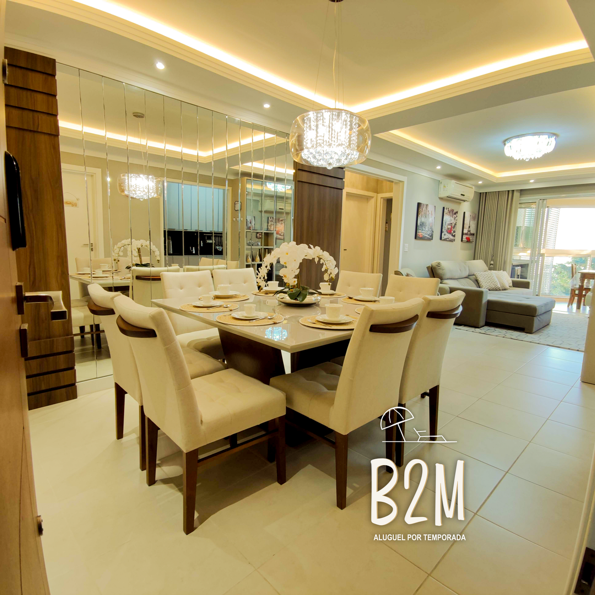 sofá, 2 poltronas, televisão, internet wifi, ar condicionado, adega, mesa de jantar para 8 pessoas