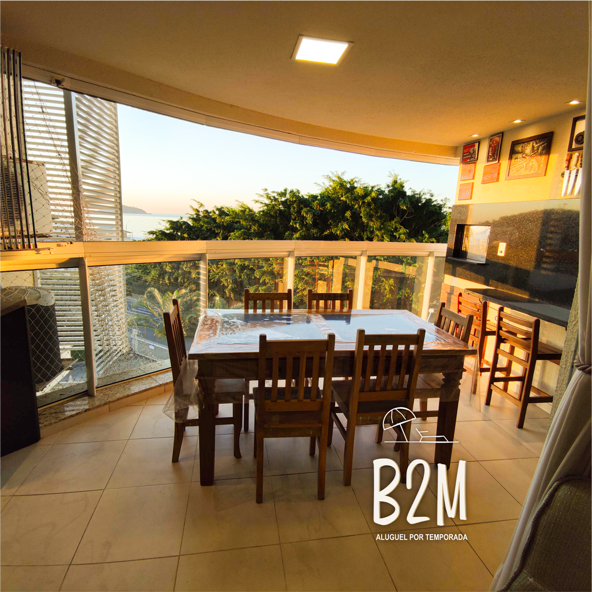 A varanda gourmet possui churrasqueira automática, cervejeira, mesa para refeições externas ...