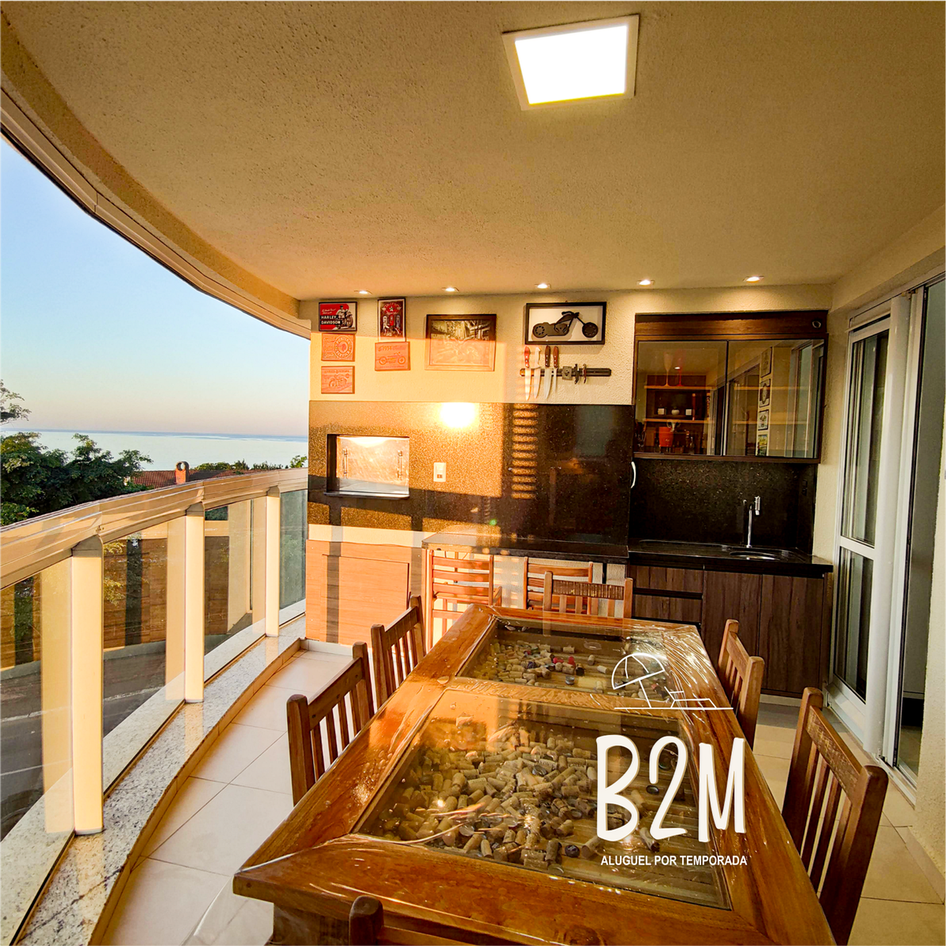churrasqueira automática, mesa com 6 cadeiras, cervejeira, armários, bancada, pia,