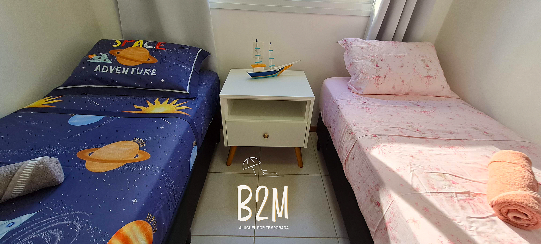 camas de solteiro, ar condicionado, cômoda