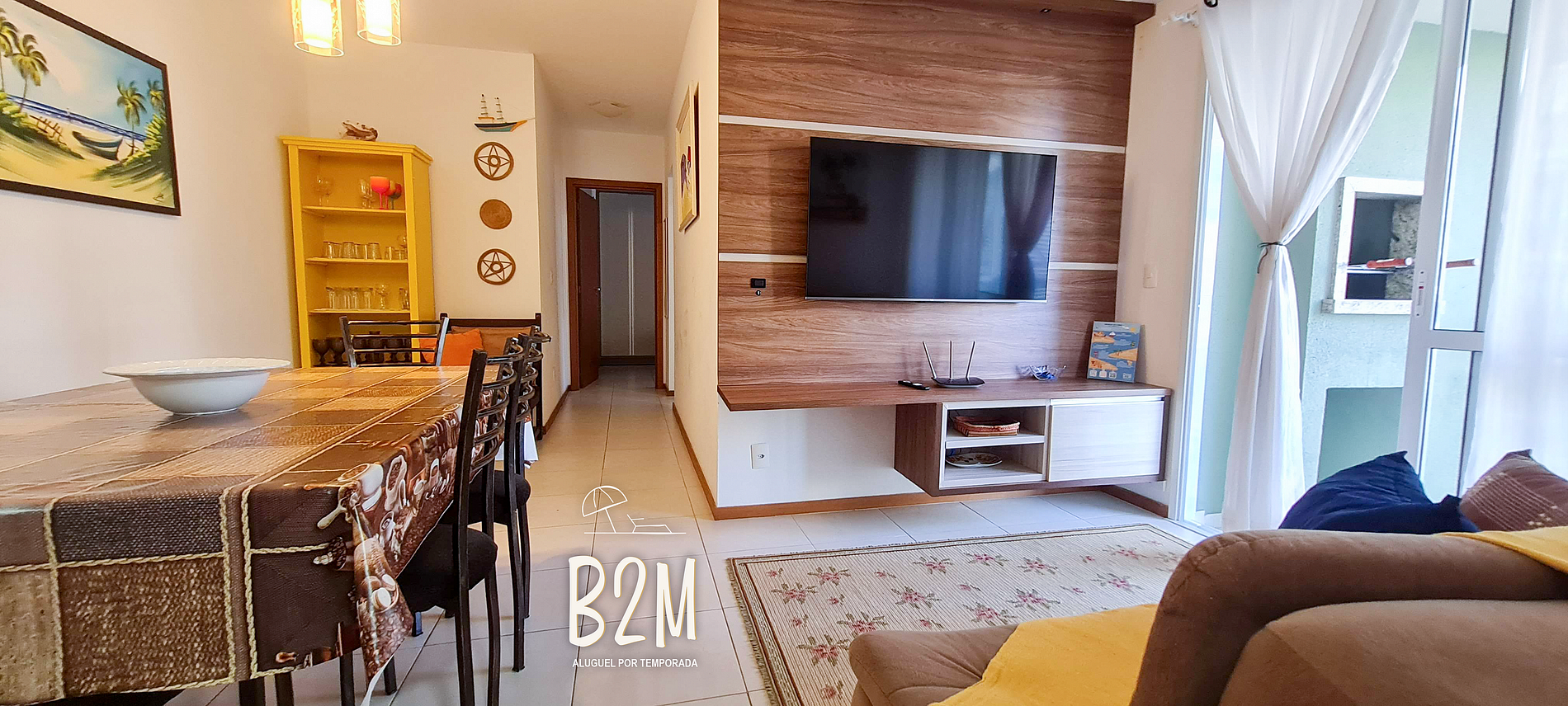 sofá confortável que vira cama, televisão, internet wifi, ar condicionado, estante, mesa de jantar para 4 pessoas, poltrona
