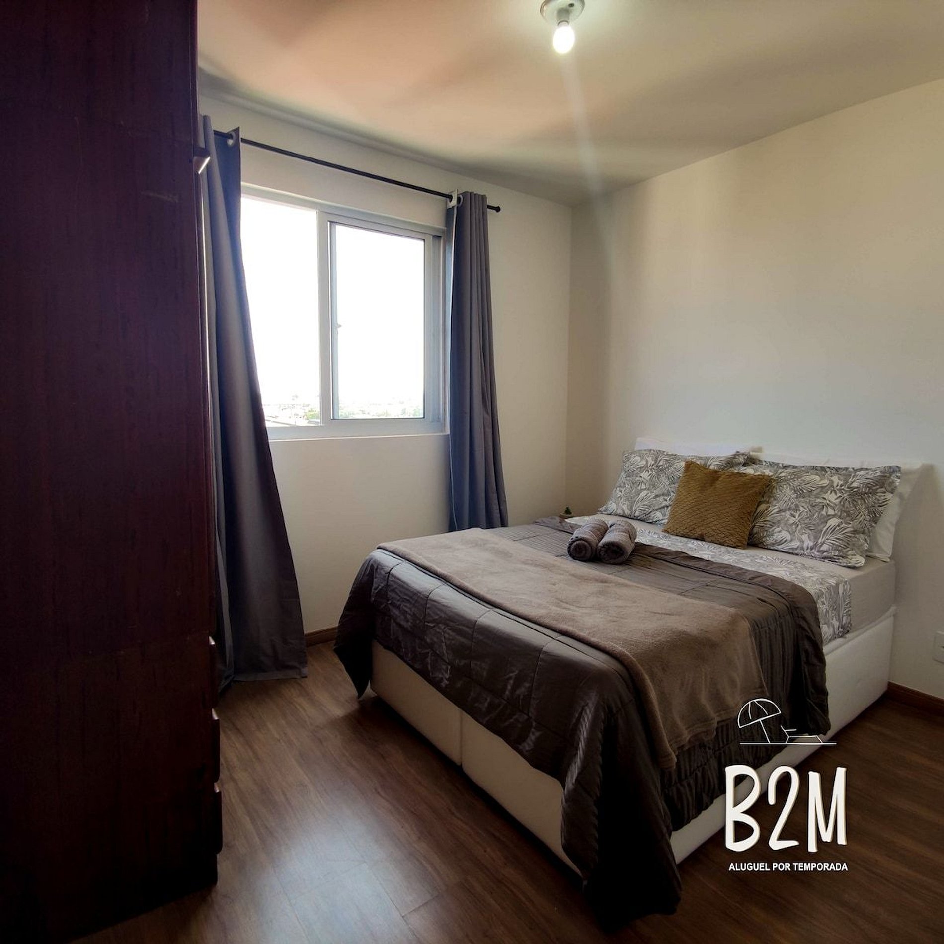 1 cama de casal, 1 colhão de solteiro extra, ar condicionado, ventilador, cômoda, cortina com blackout