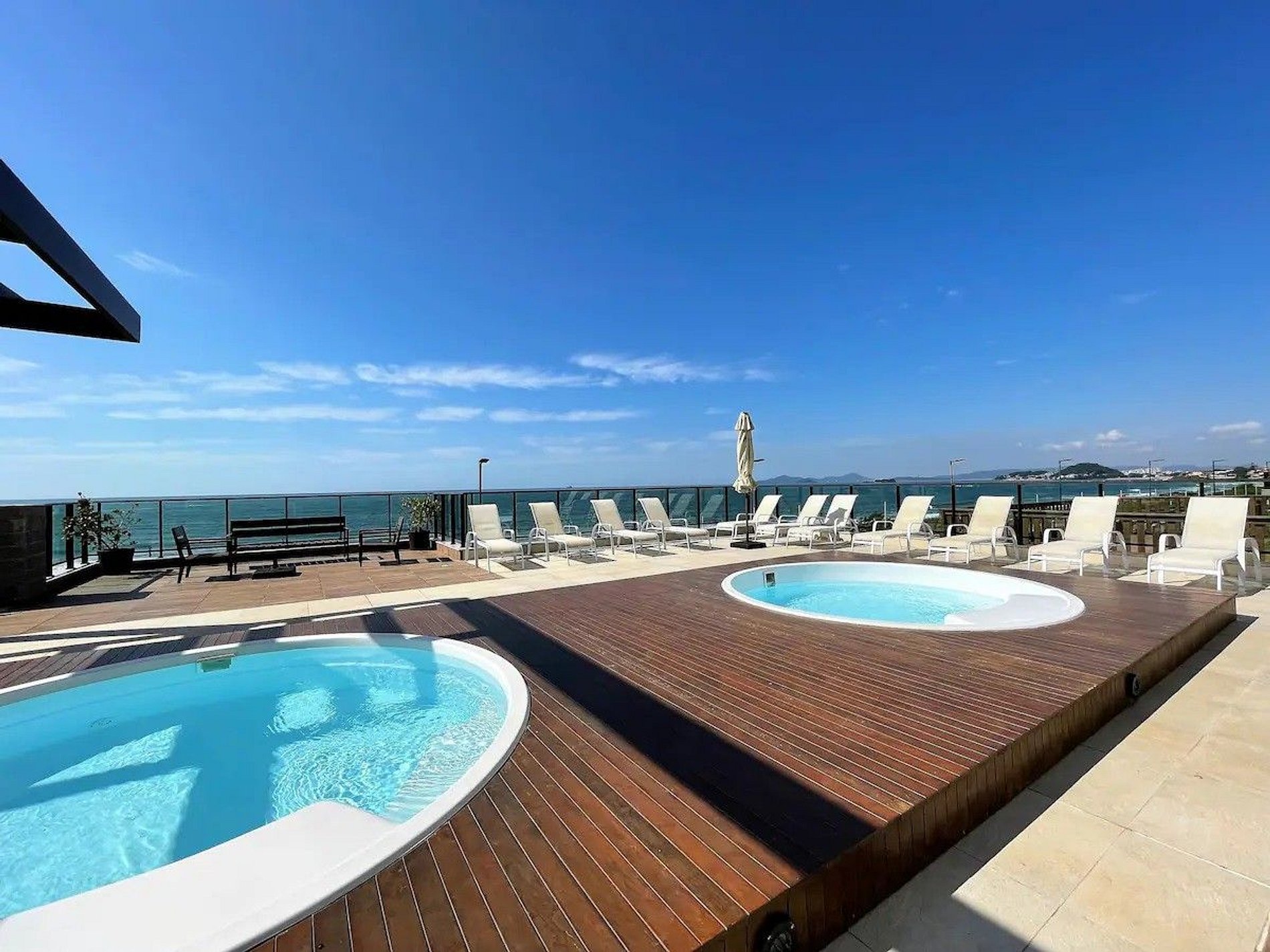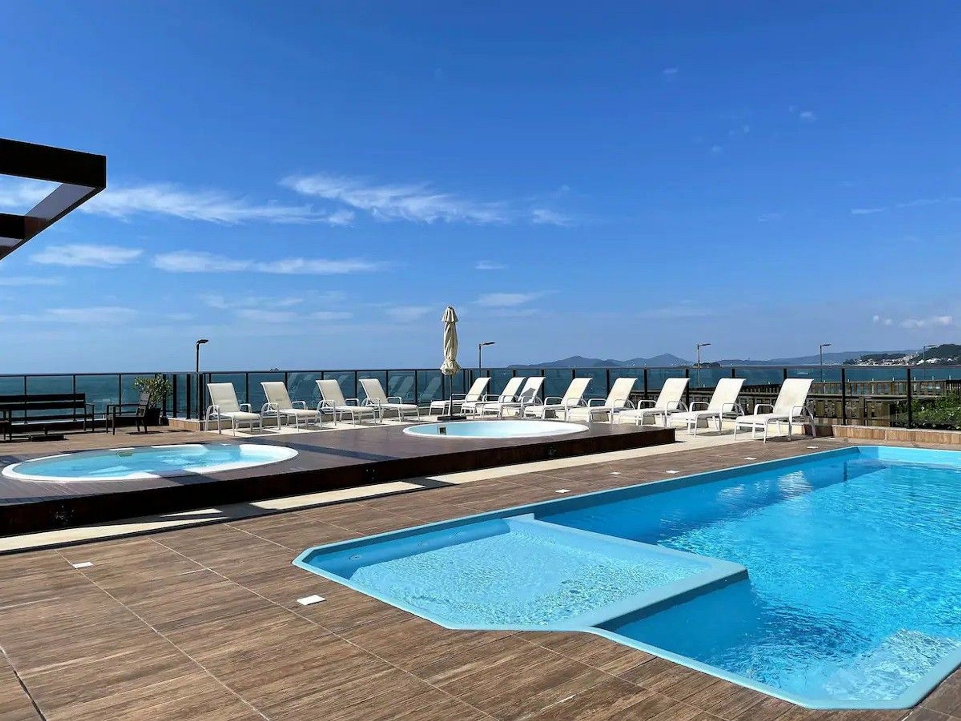 Banheira de hidromassagem e piscina com vista para o mar para relaxar e curtir o que há de melhor no litoral de Santa Catarina.
