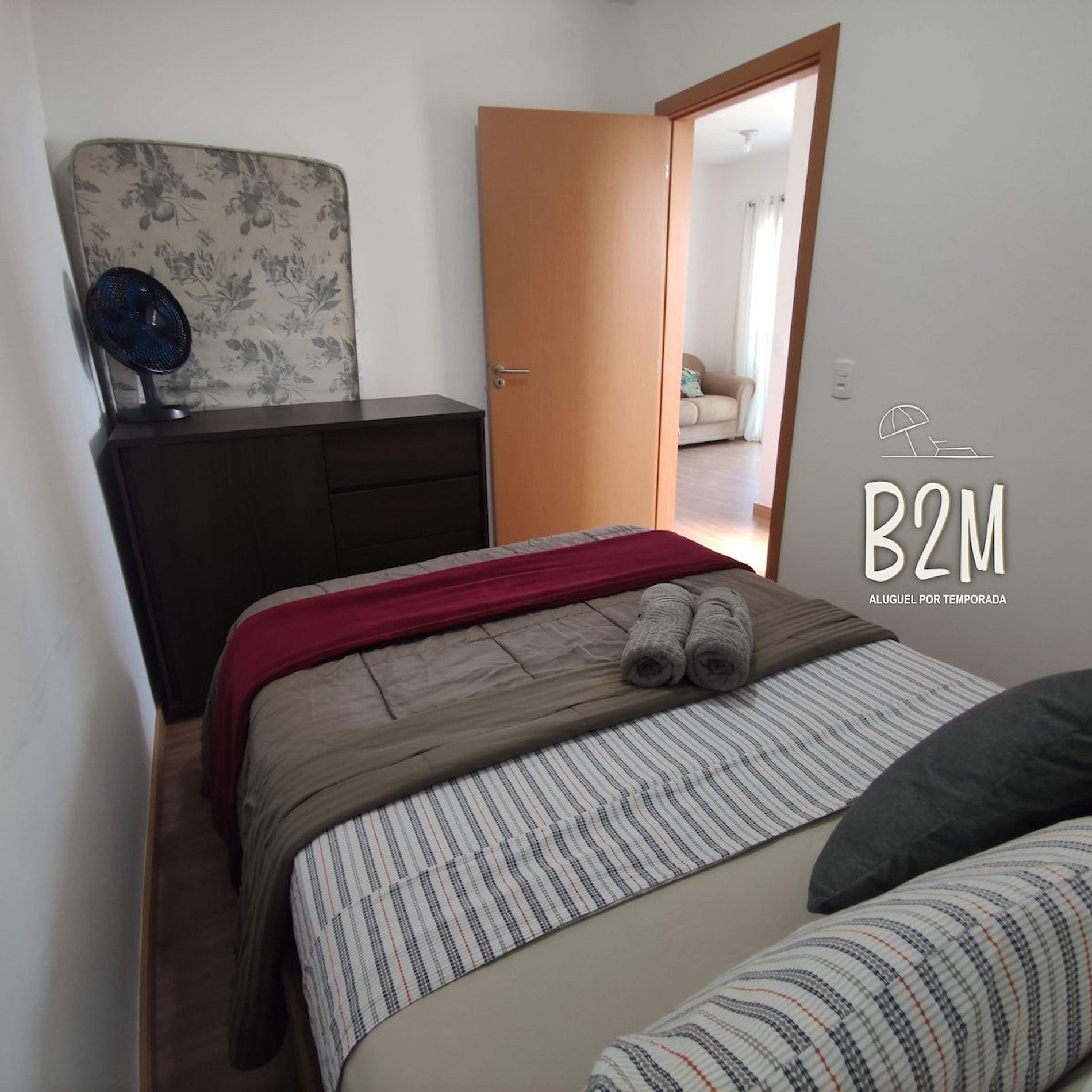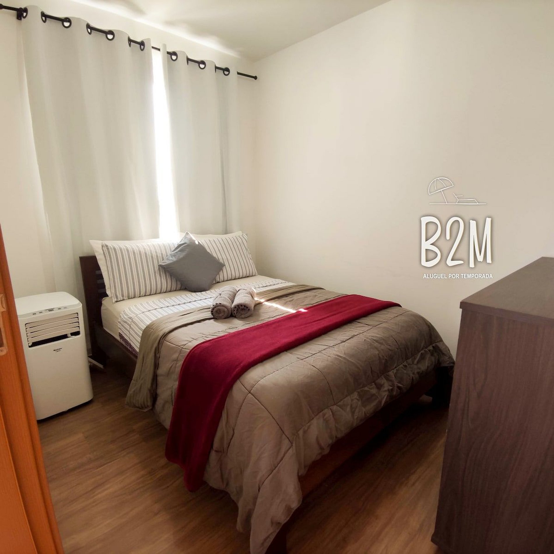 1 cama de casal, 1 colhão de solteiro extra, ar condicionado, ventilador, cômoda, cortina com blackout