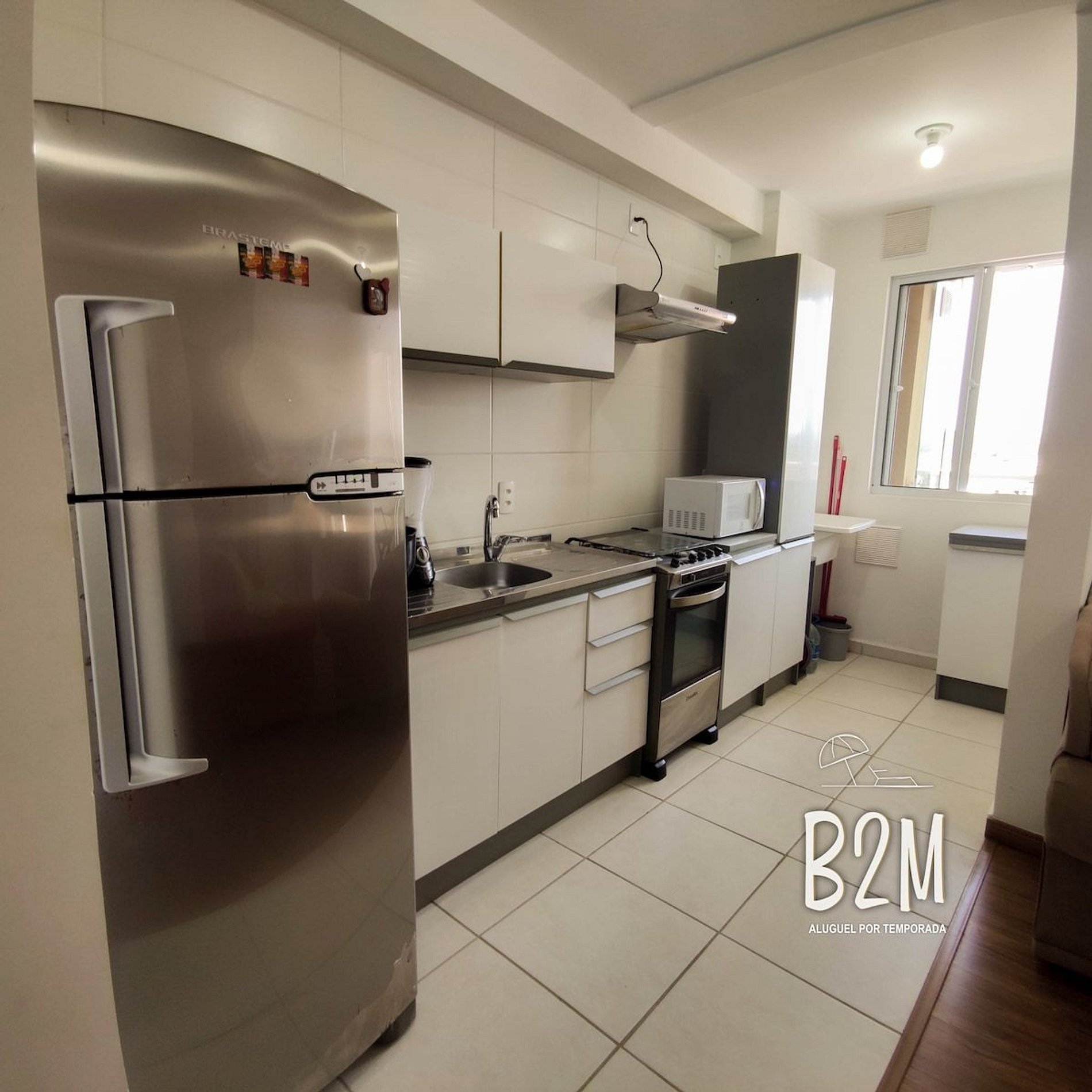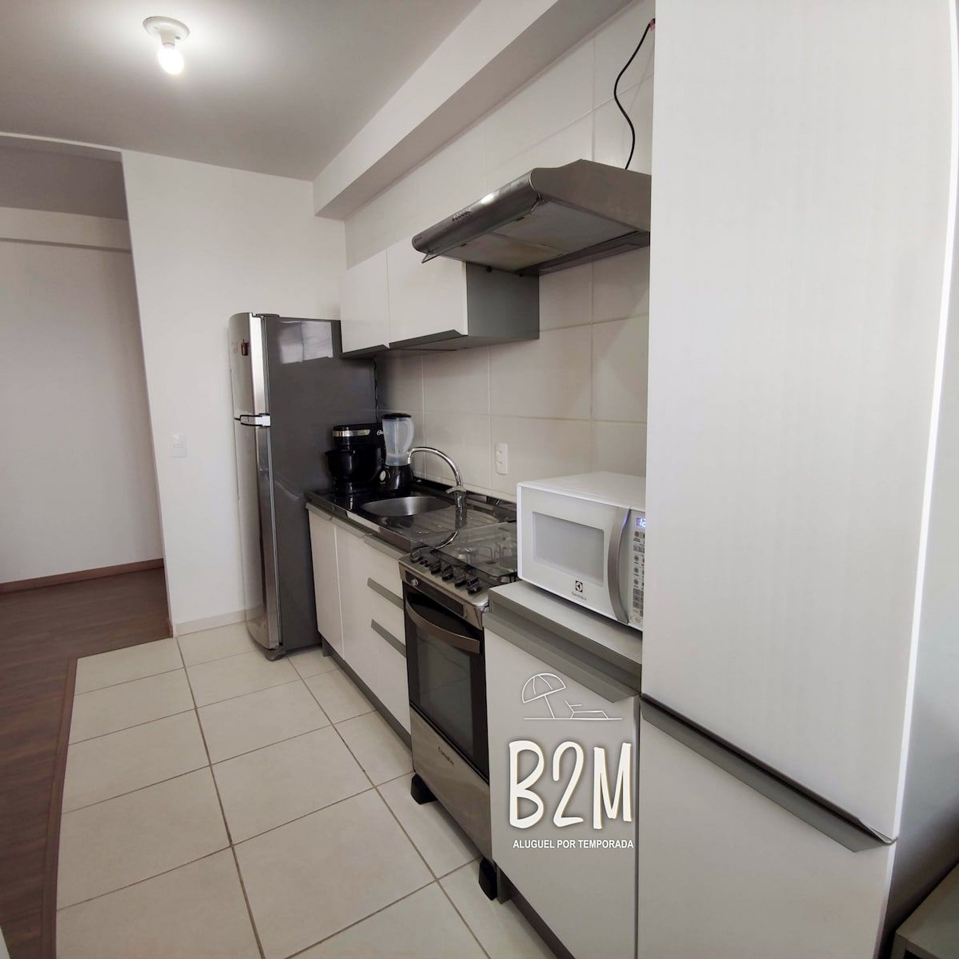 geladeira, microondas, fogão, sanduicheira, cafeteira, liquidificador, panelas, talheres e utensílios para o preparado de deliciosas refeições.