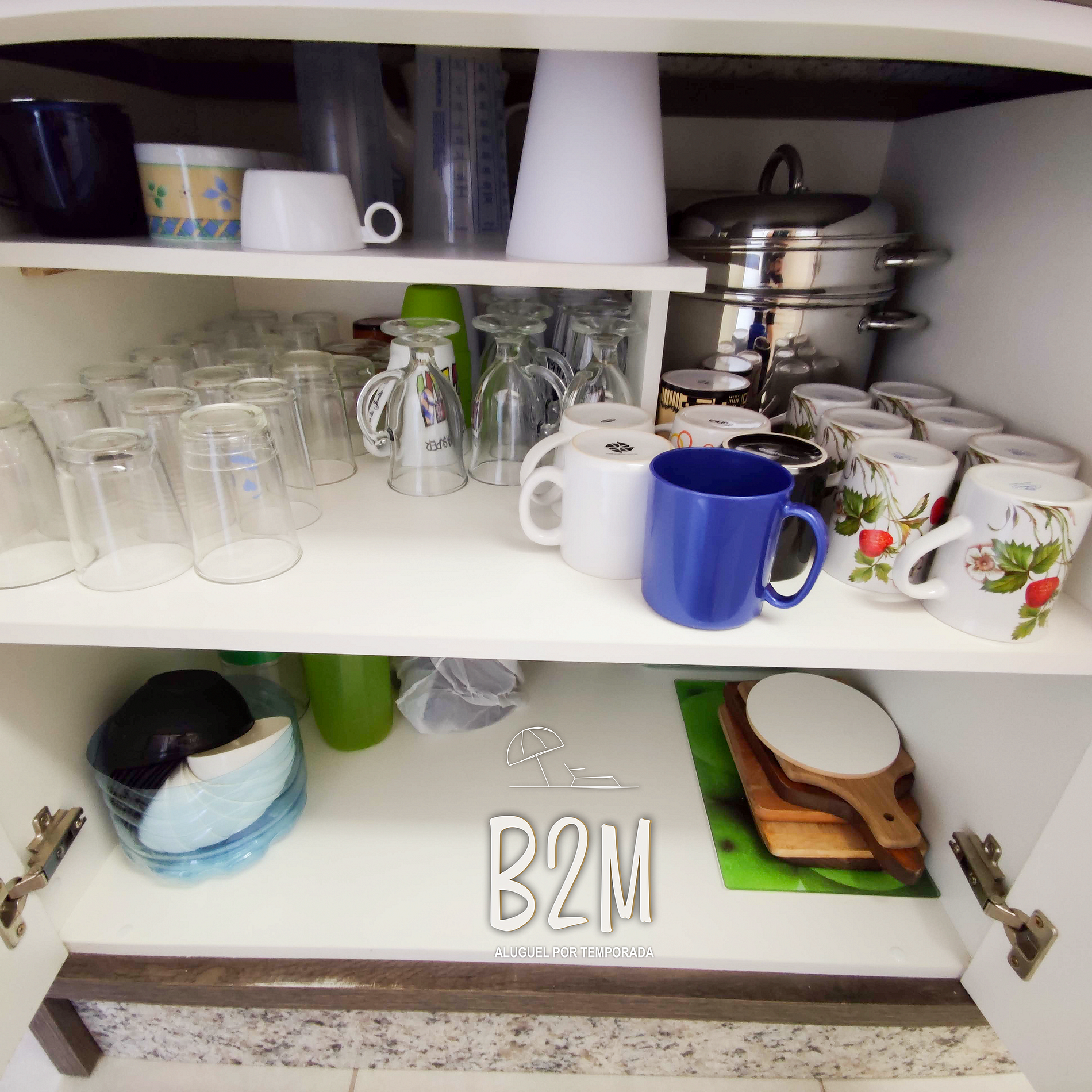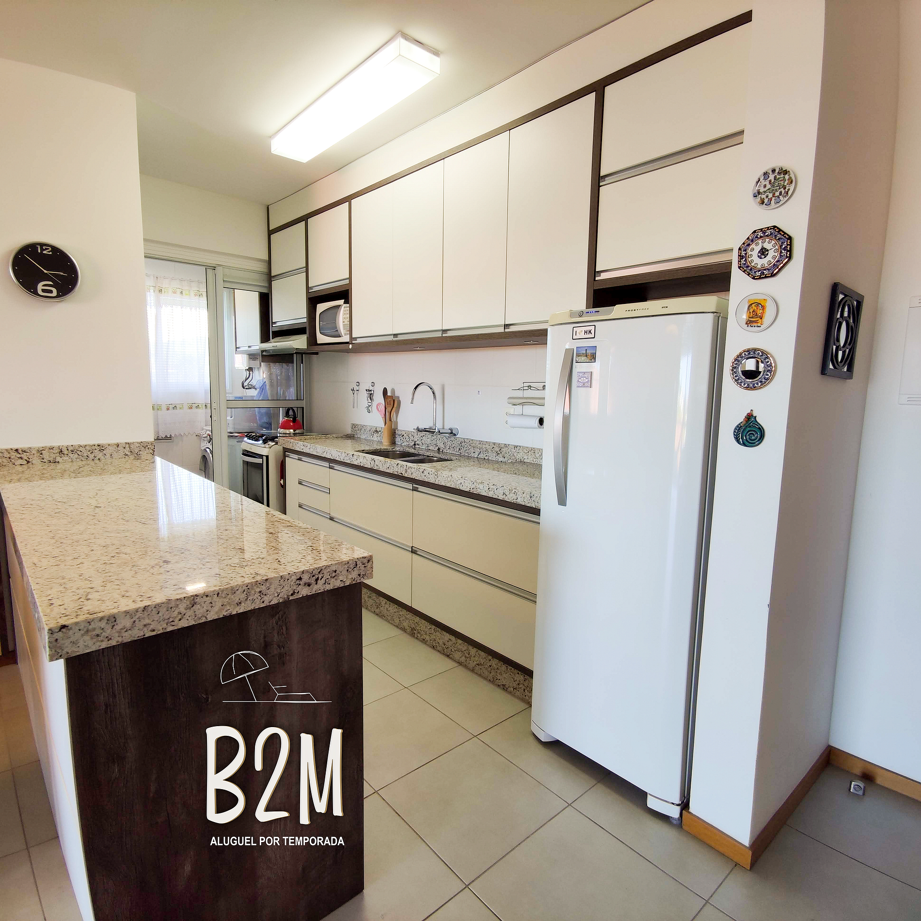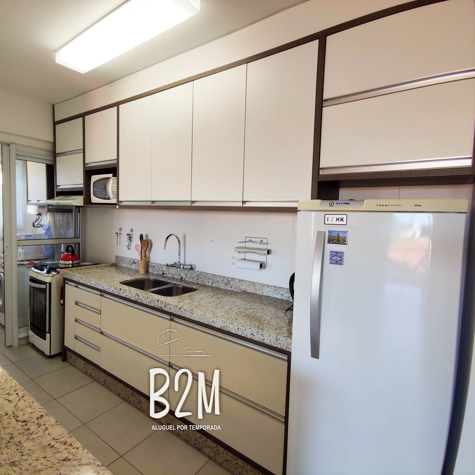 geladeira, microondas, fogão, forno, liquidificador, sanduicheira, maquina de waffle, panelas, talheres e utensílios para o preparado de deliciosas refeições