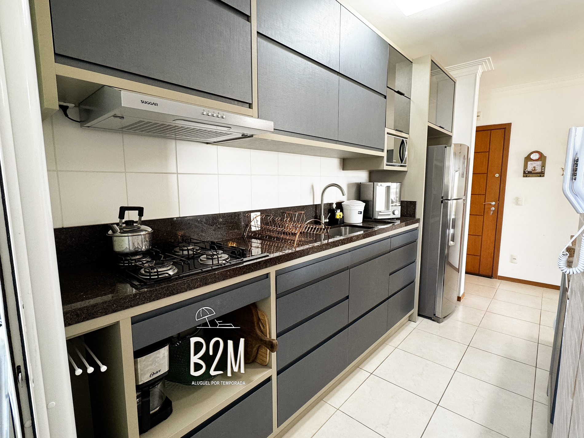 geladeira, microondas, fogão, forno, liquidificador, bebedouro, cafeteira elétrica, panelas, talheres e utensílios para o preparado de deliciosas refeições.