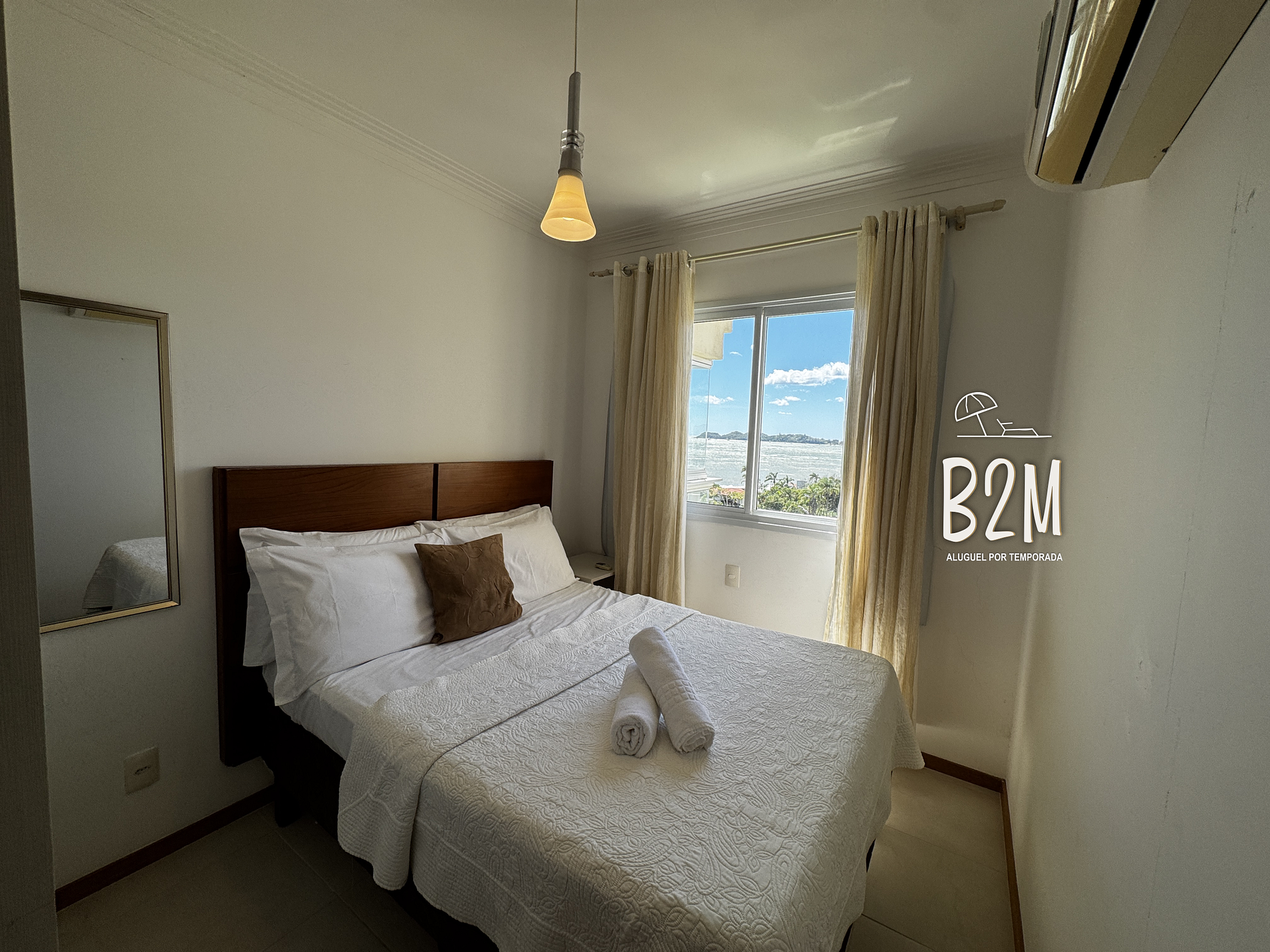 varanda com vista do mar, 1 cama queen, 1 colchão de solteiro extra, ar condicionado, armário, banheiro privativo com água aquecida