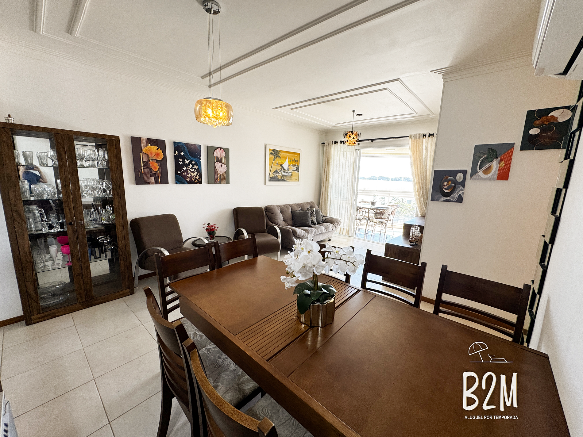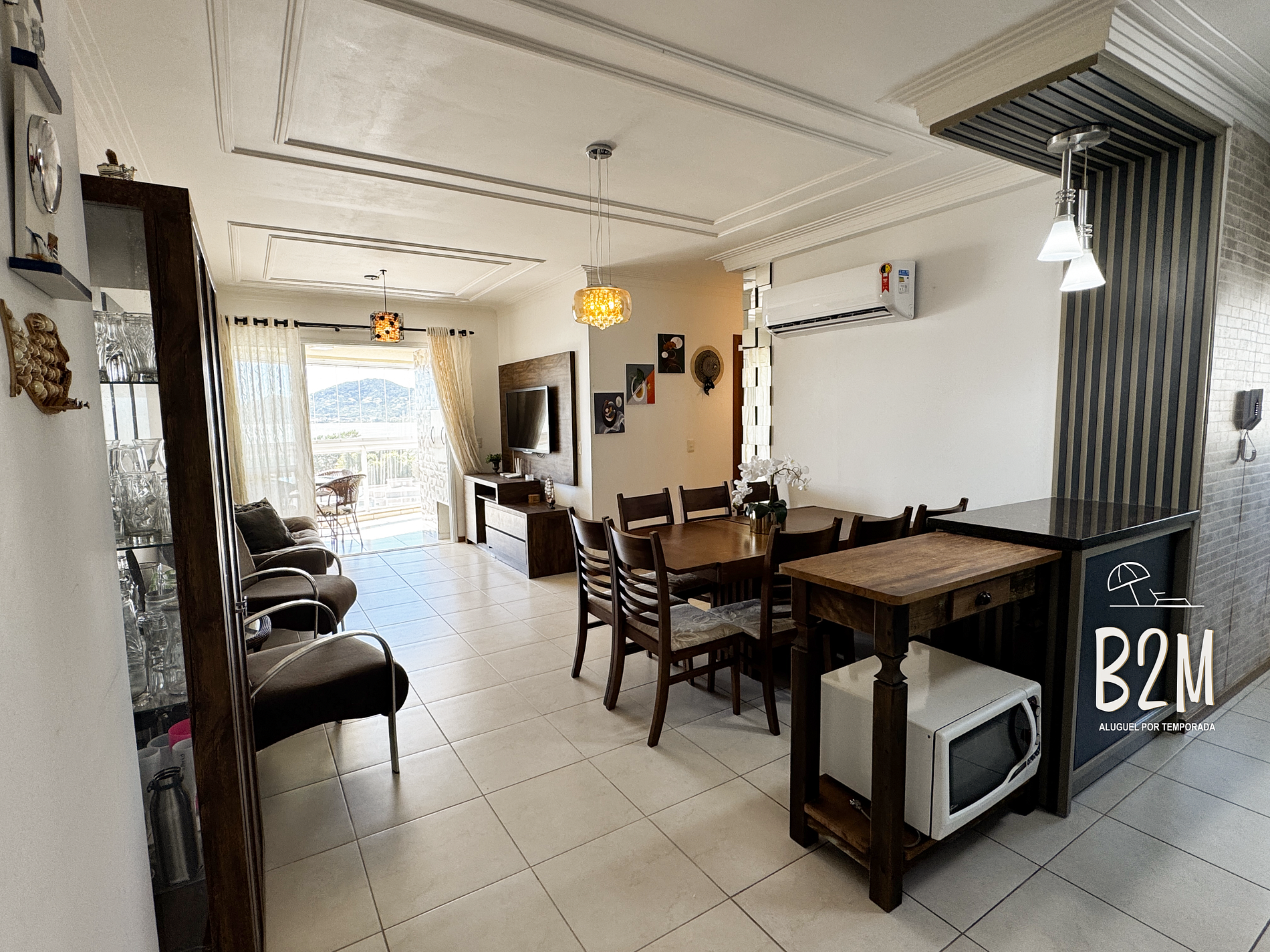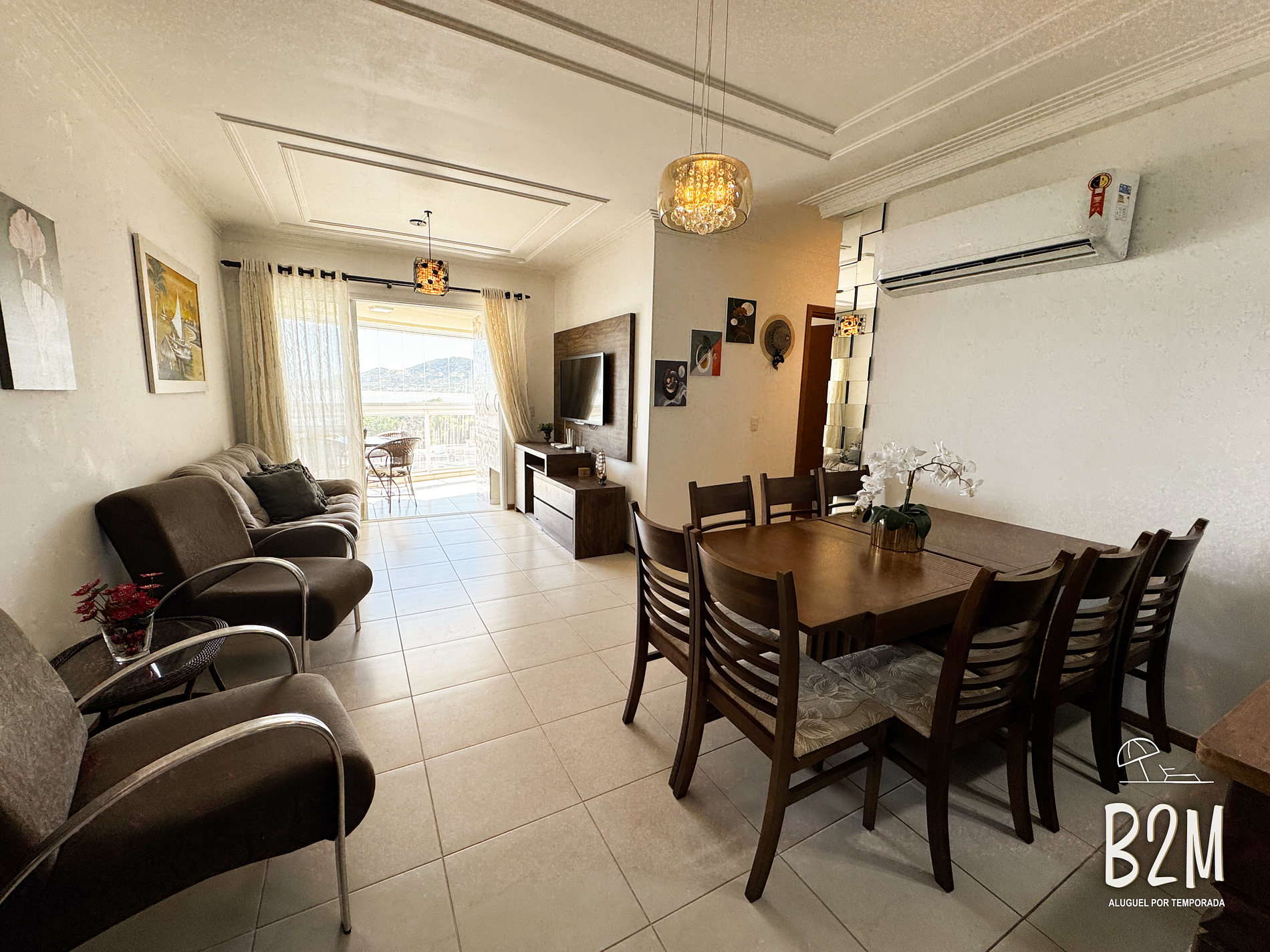 sofá, 2 poltronas, televisão, internet wifi, mesa de jantar para 8 pessoas