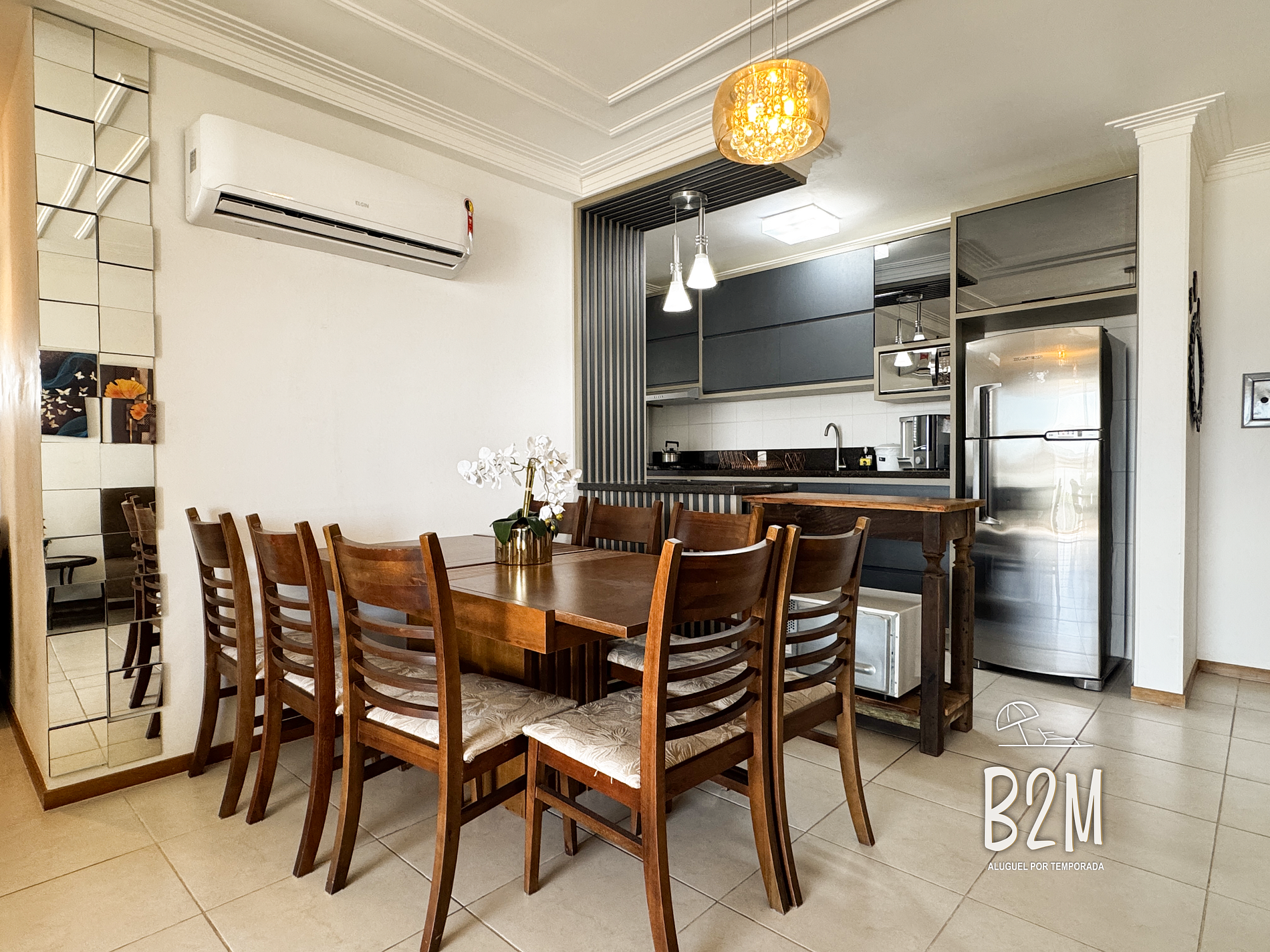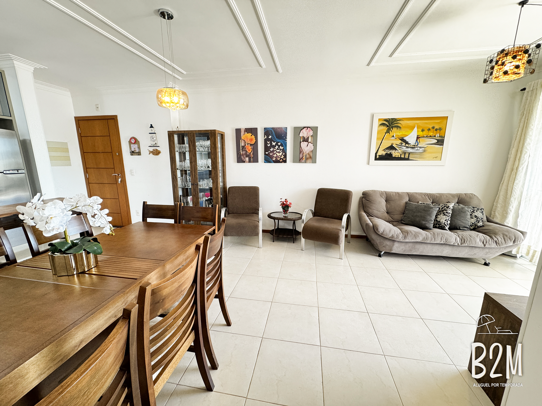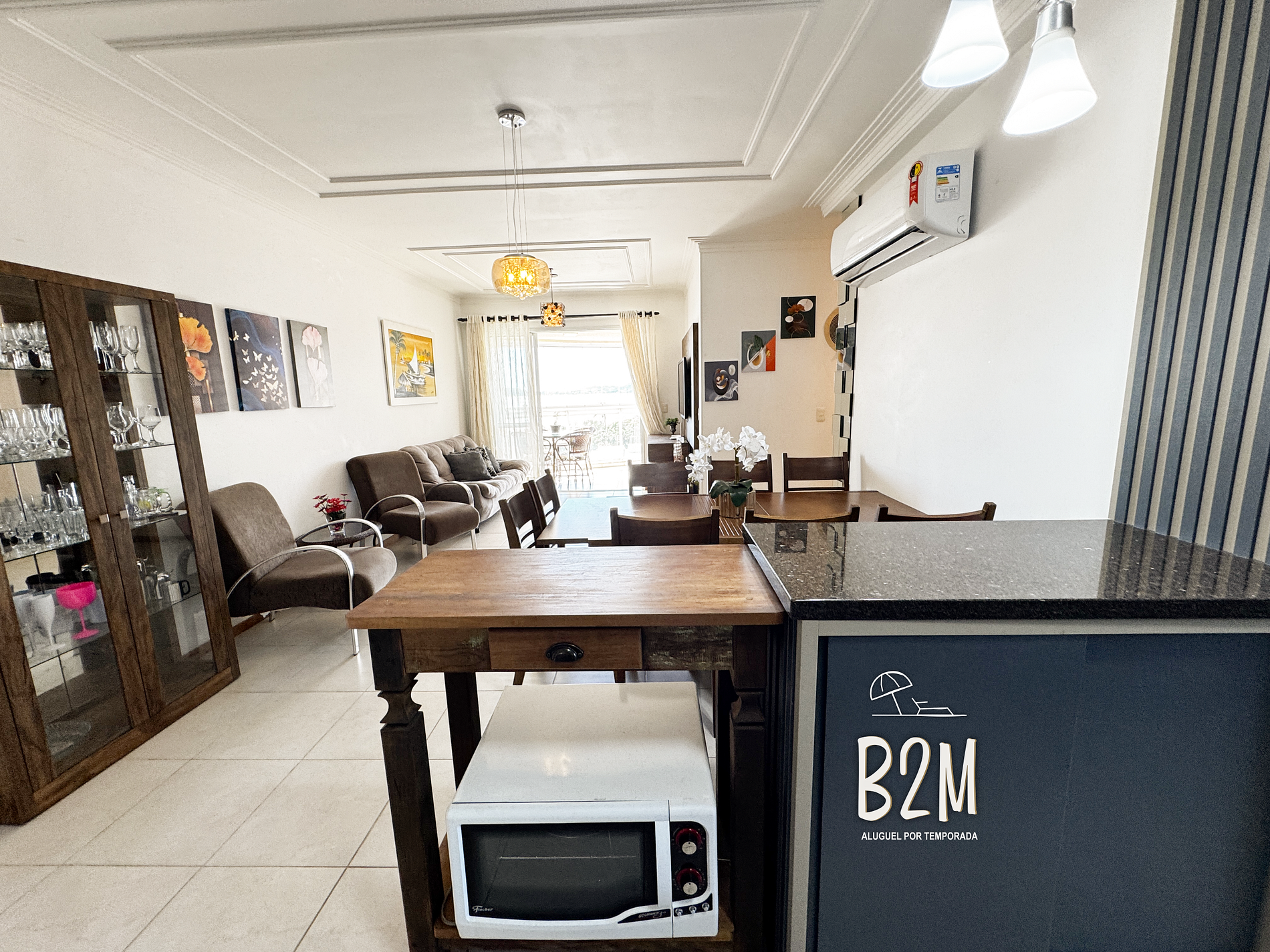 sofá, 2 poltronas, televisão, internet wifi, mesa de jantar para 8 pessoas