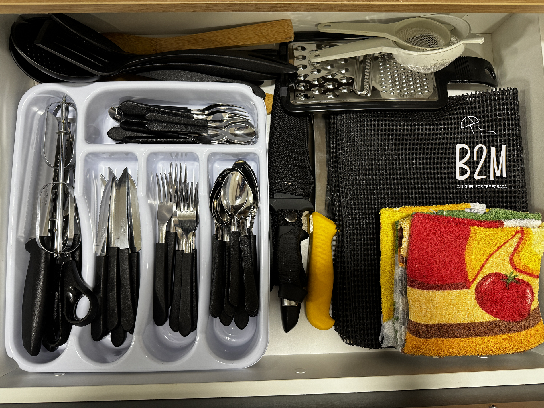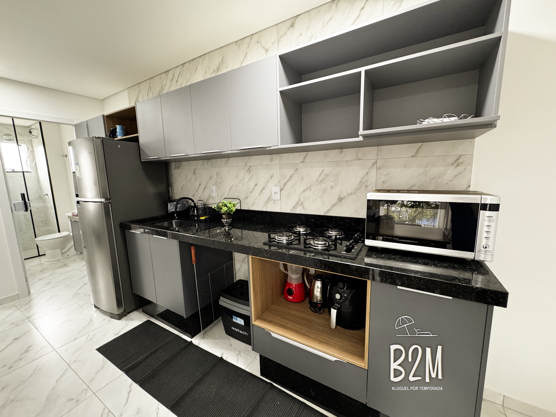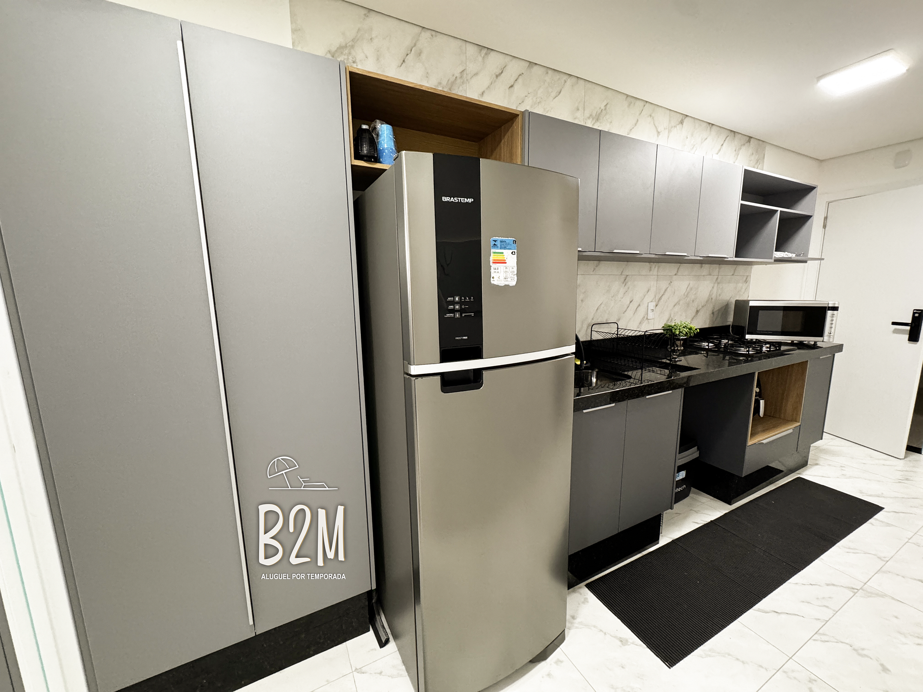 geladeira duplex, microondas, fogão, cafeteira, liquidificador, panelas, talheres e utensílios para o preparado de deliciosas refeições