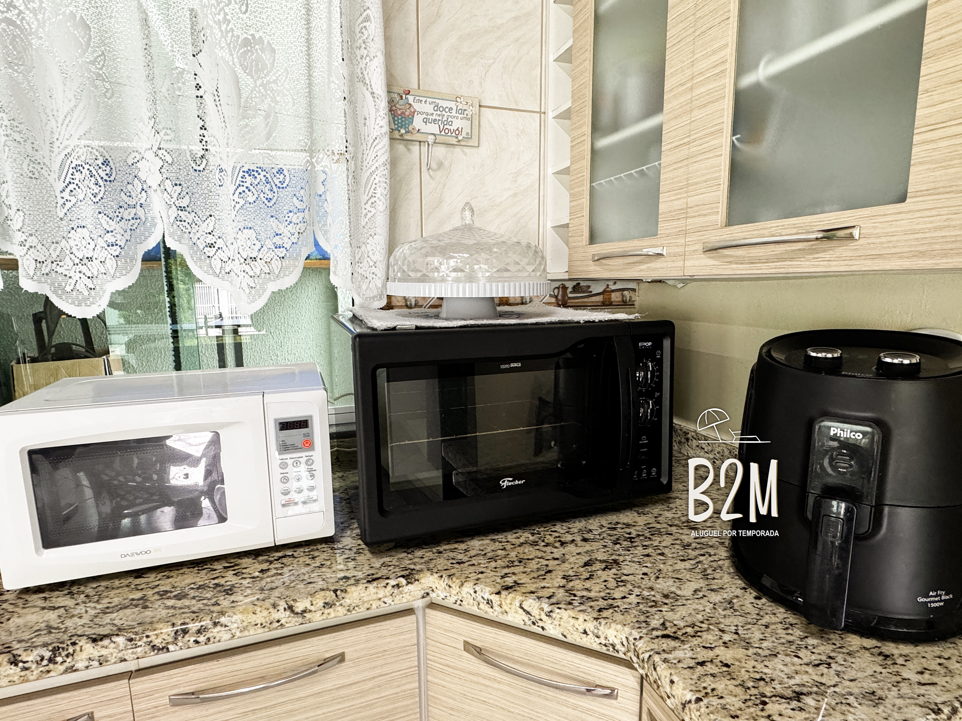 geladeira, freezer, microondas, fogão, forno, liquidificador, mesa para até 12 pessoas, panelas, talheres e utensílios para o preparo de refeições.