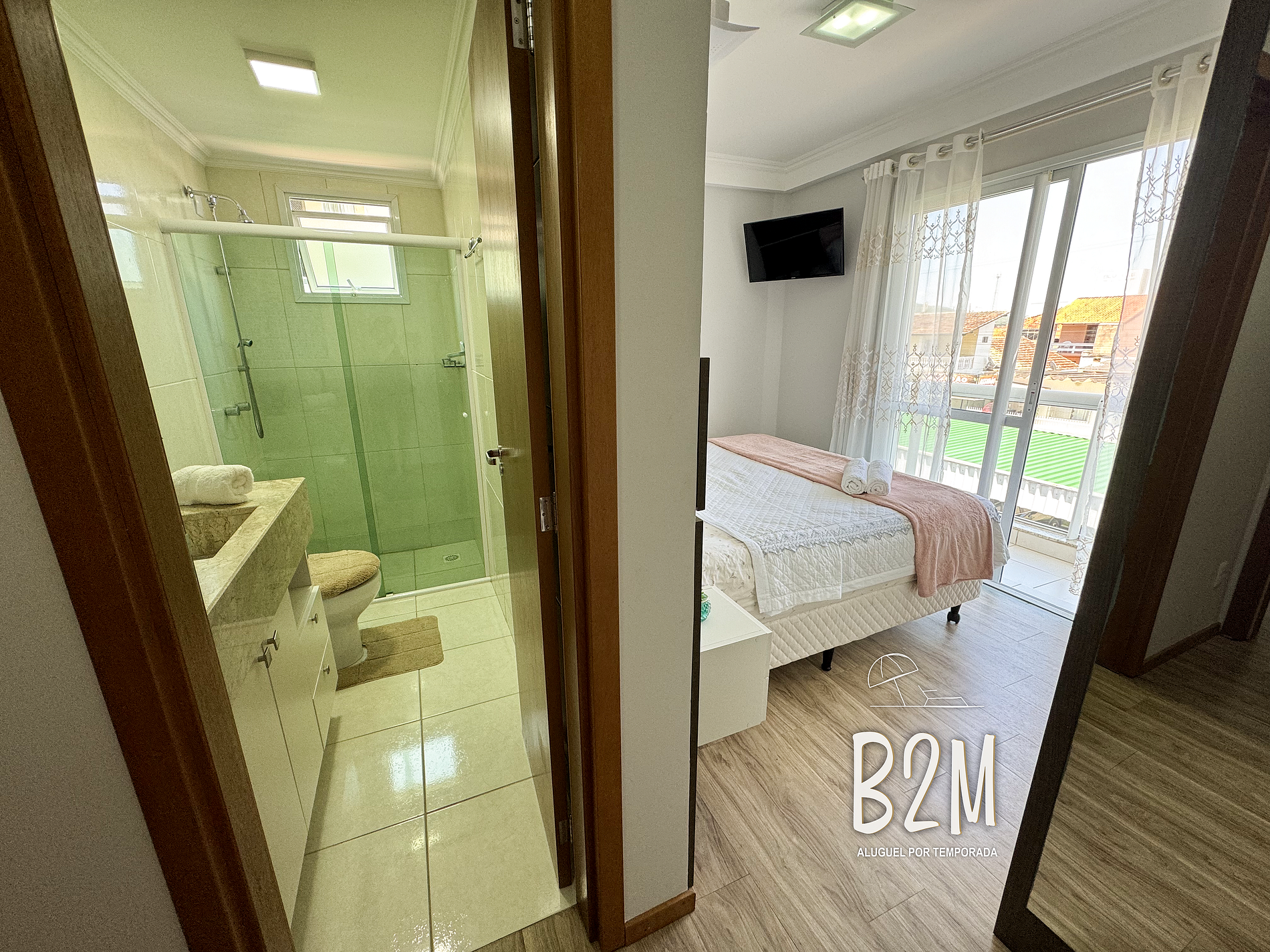 varanda com vista do mar, 1 cama queen, televisão, ar condicionado, criado mudo, cortina, armário, piso laminado, banheiro privativo com água aquecida a gás