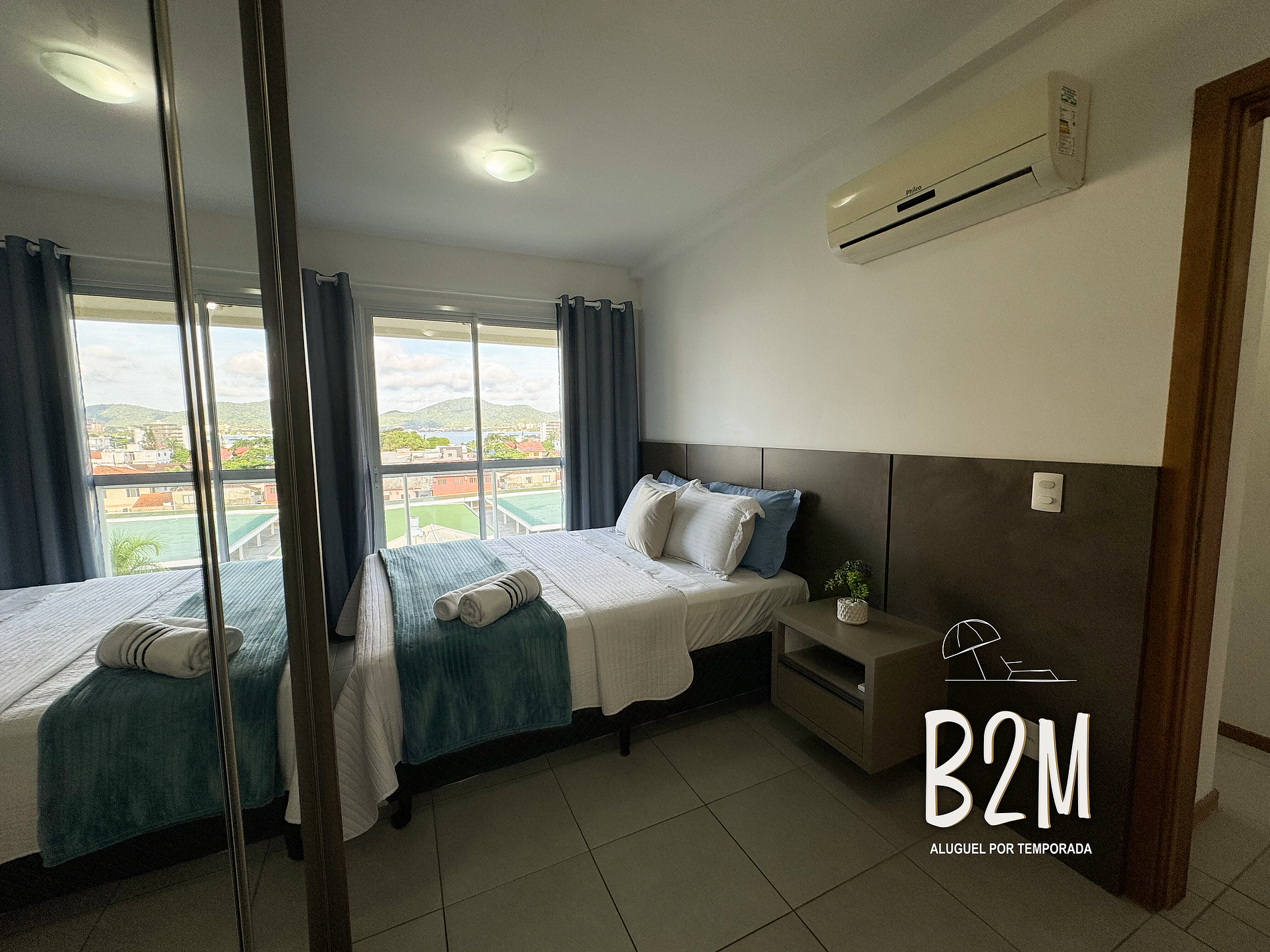cama de casal, ventilador, armário, janela vista mar