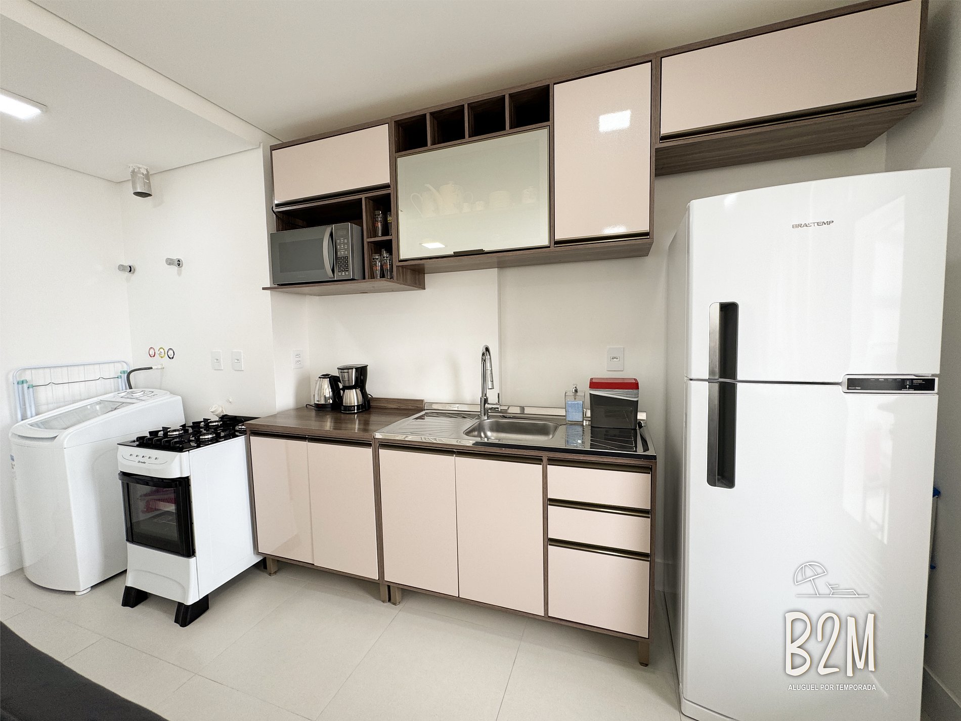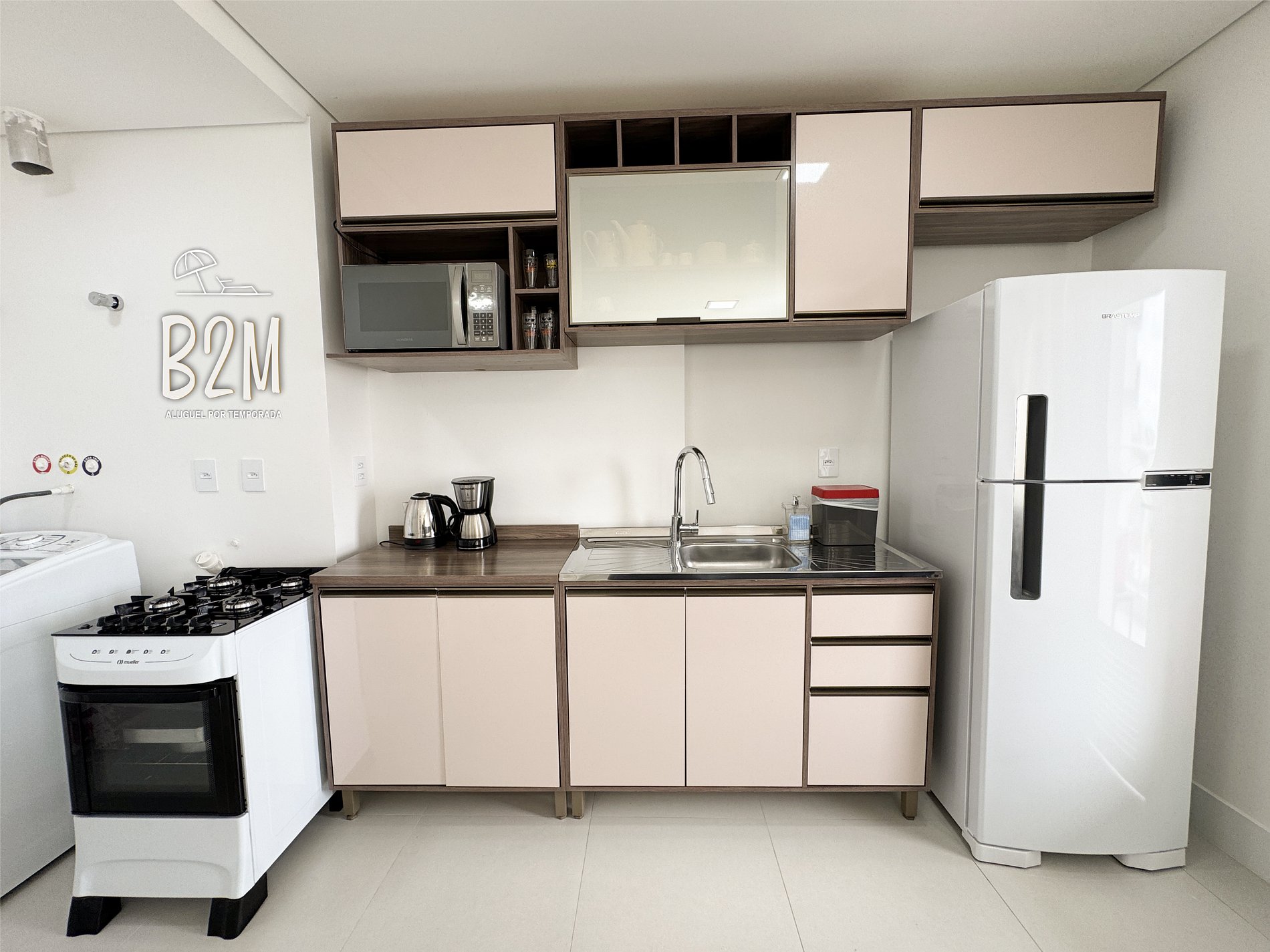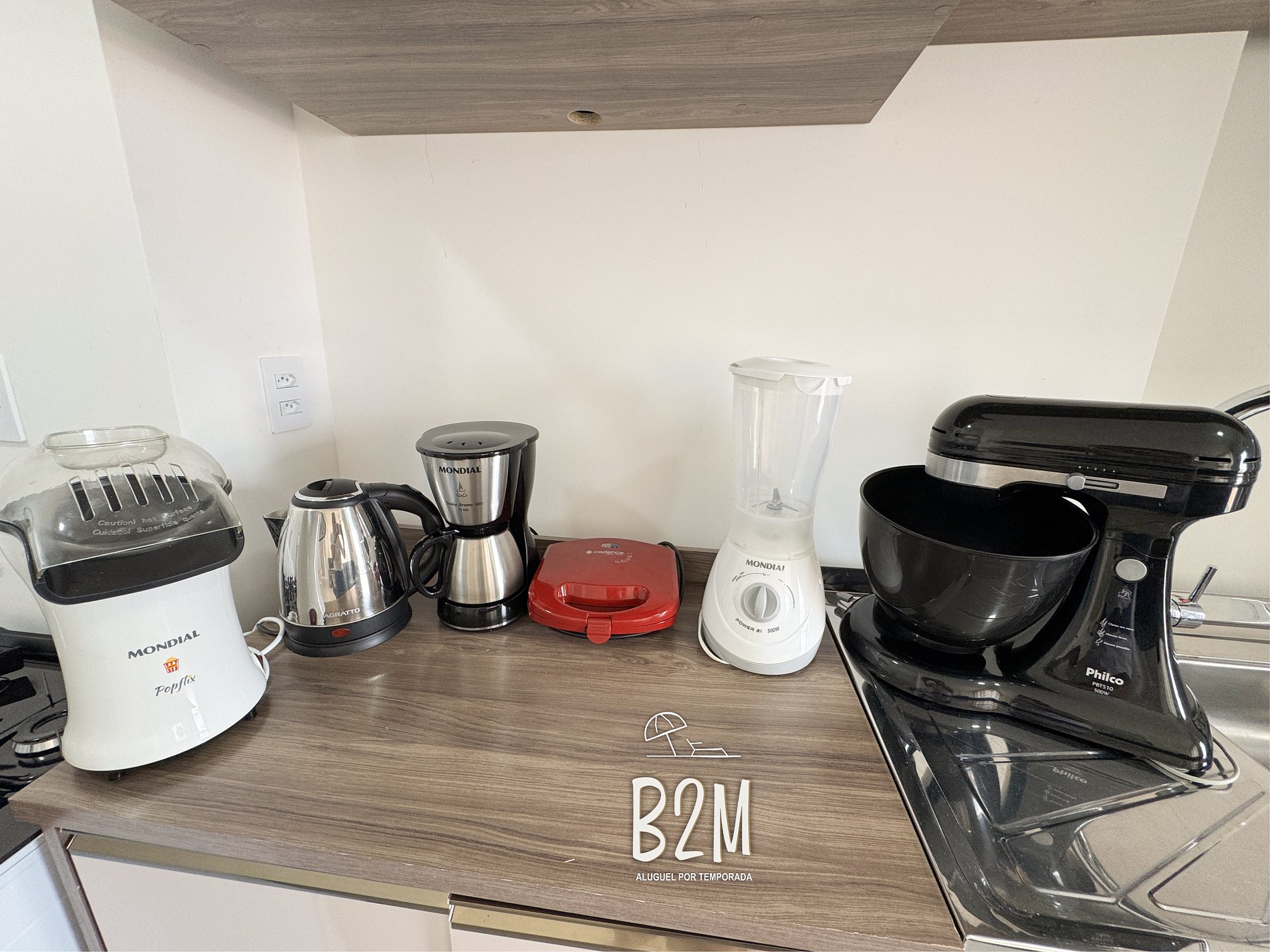geladeira, microondas, fogão, forno, liquidificador, panelas, talheres e utensílios para o preparado de deliciosas refeições.