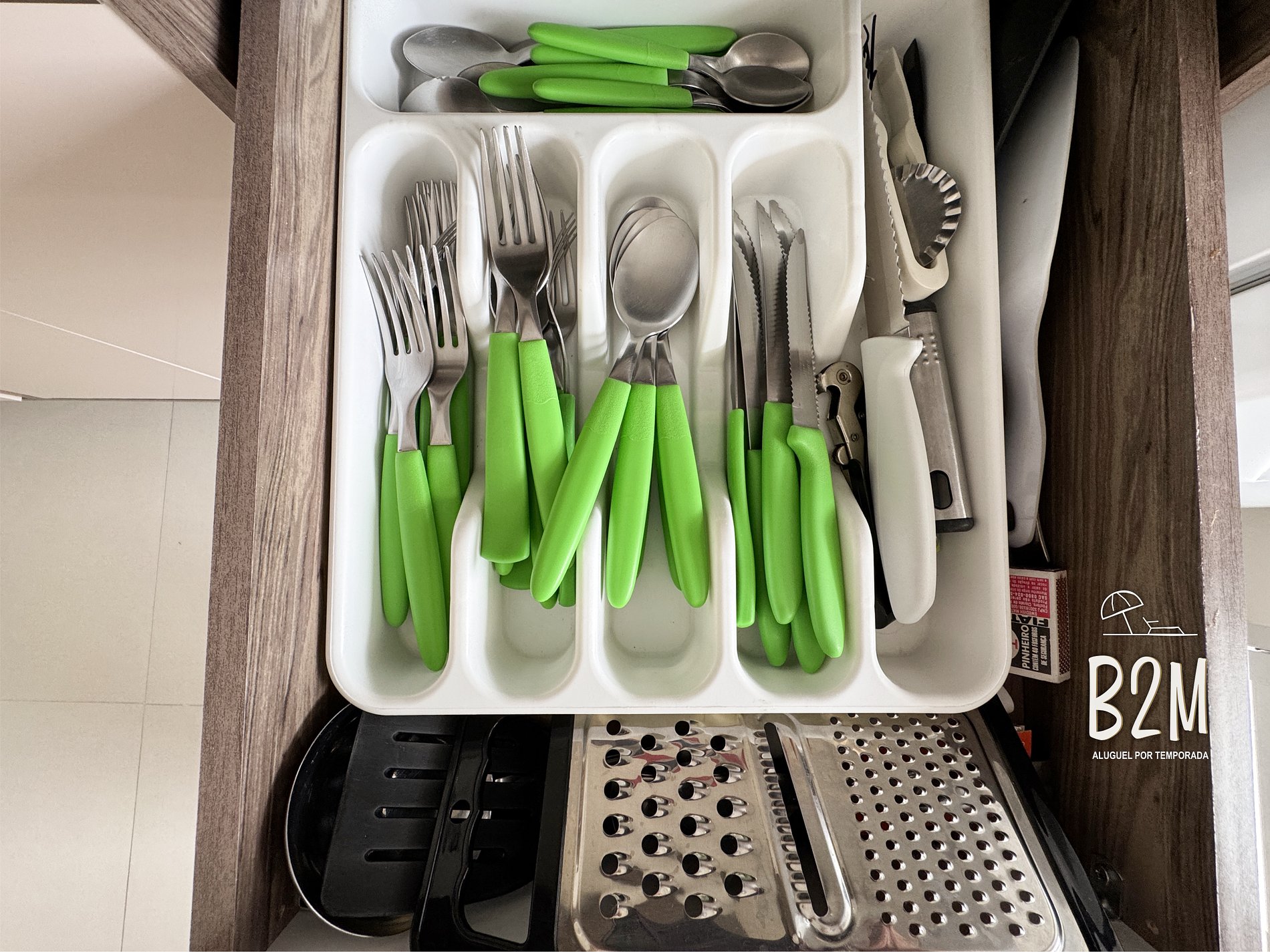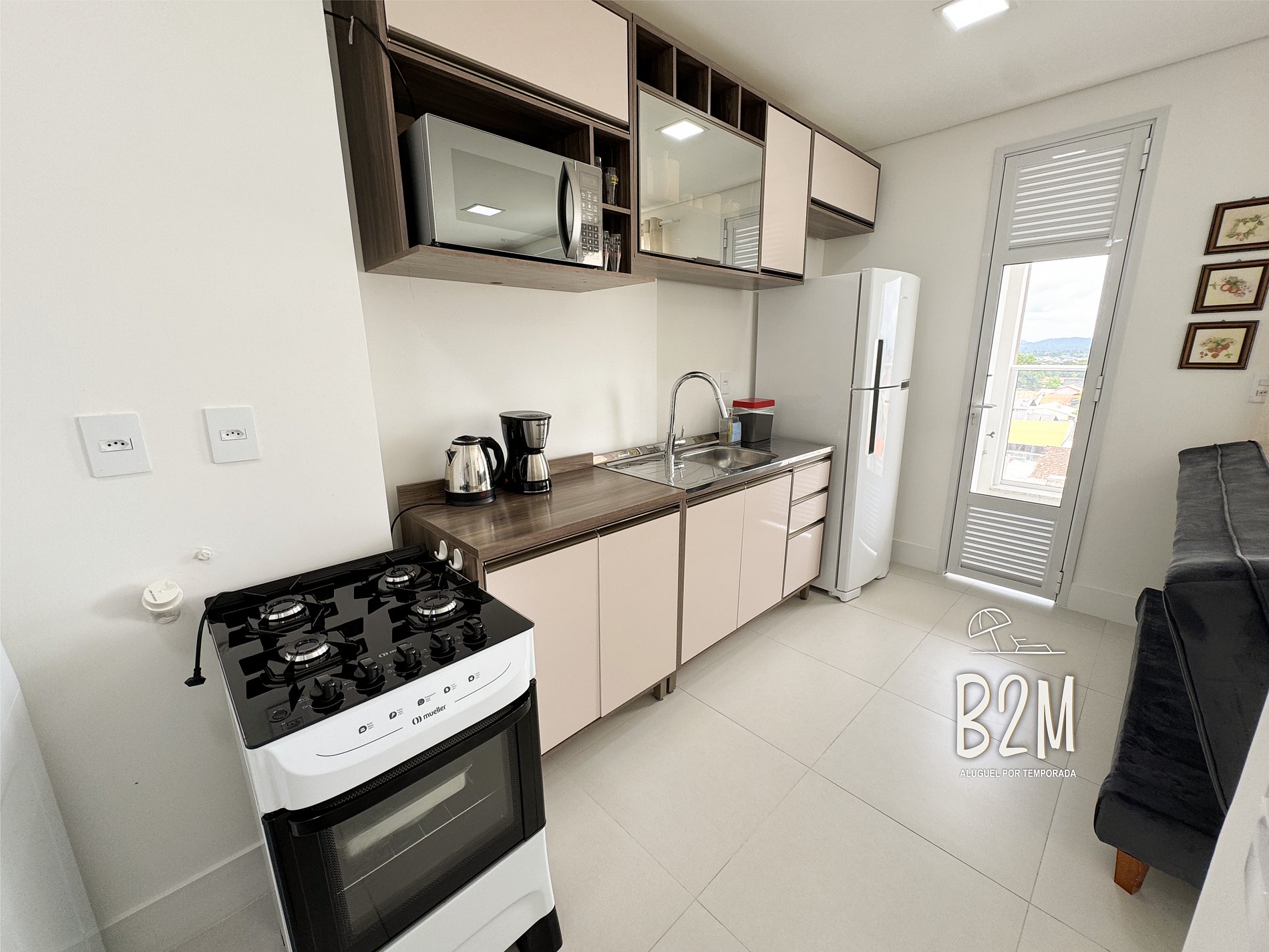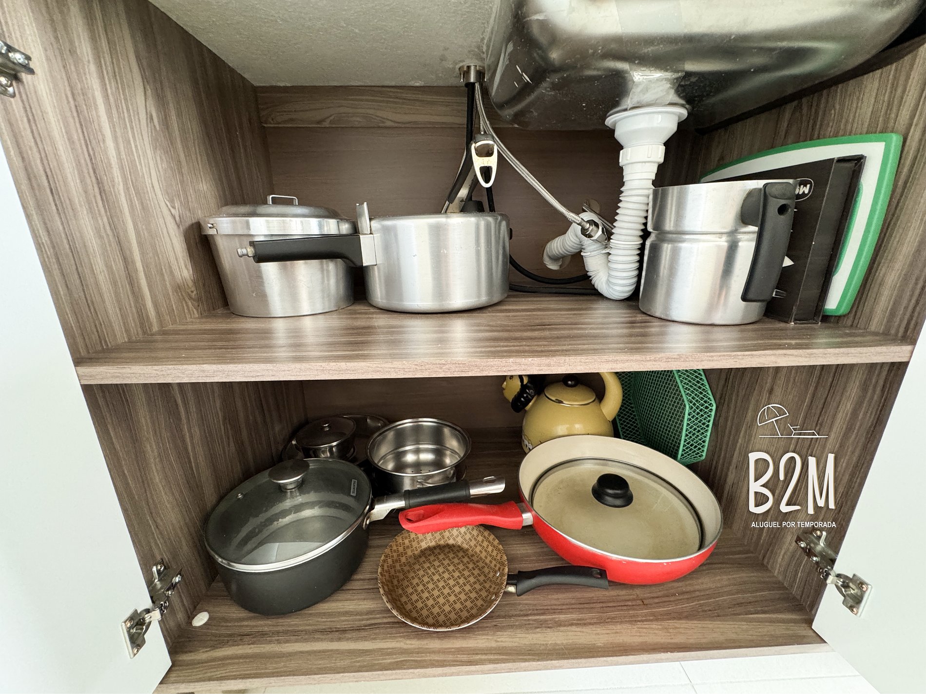 geladeira, microondas, fogão, forno, liquidificador, panelas, talheres e utensílios para o preparado de deliciosas refeições.
