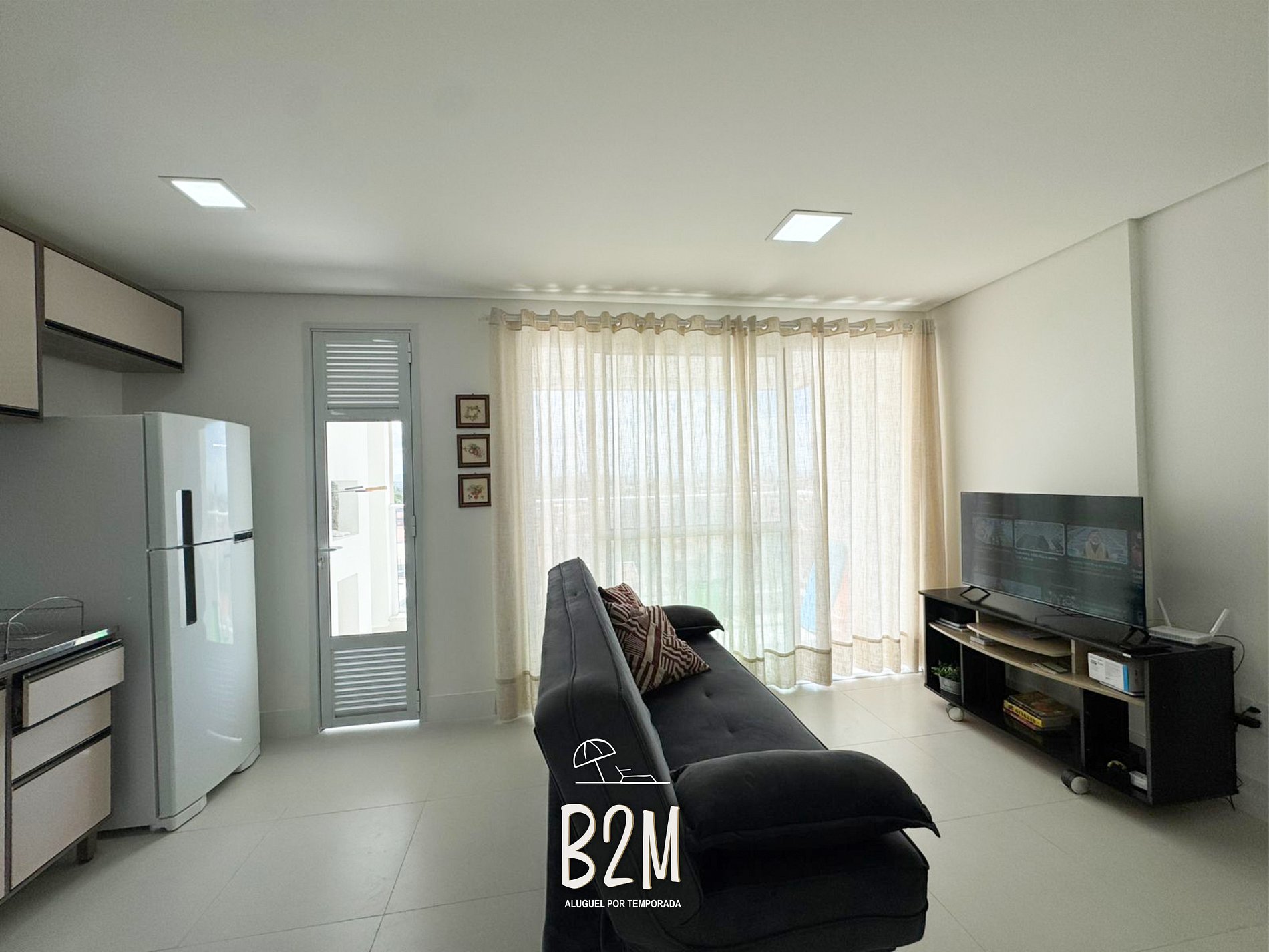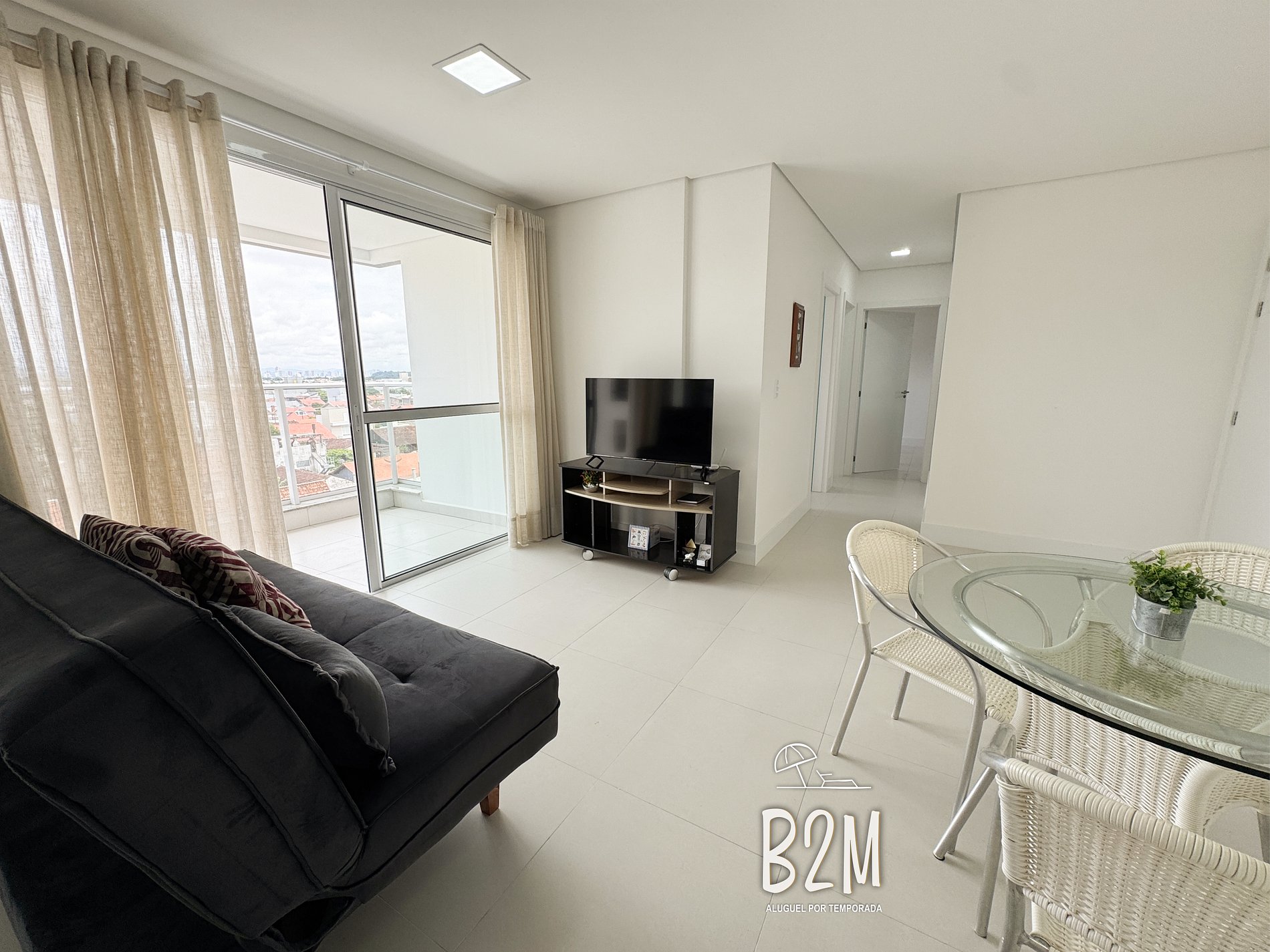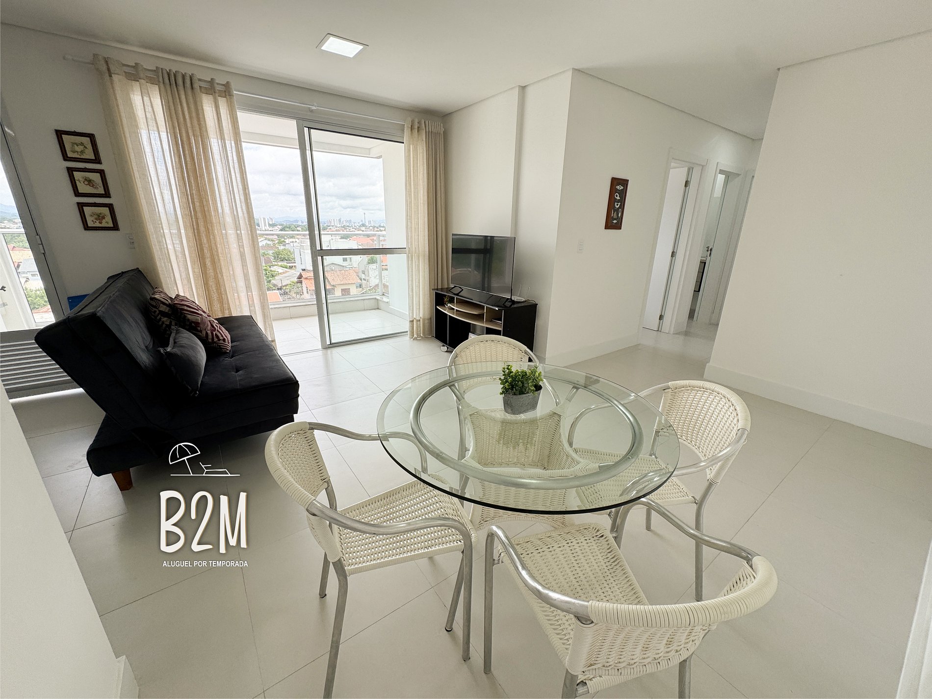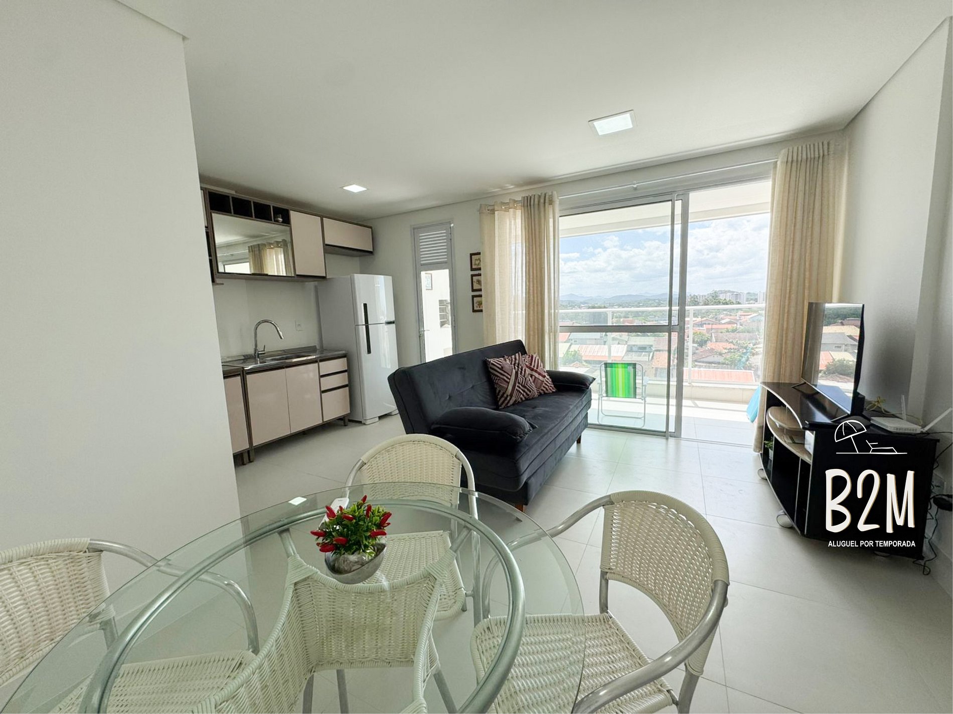 sofá, ar condicionado, internet wifi, mesa de jantar para 4 pessoas.