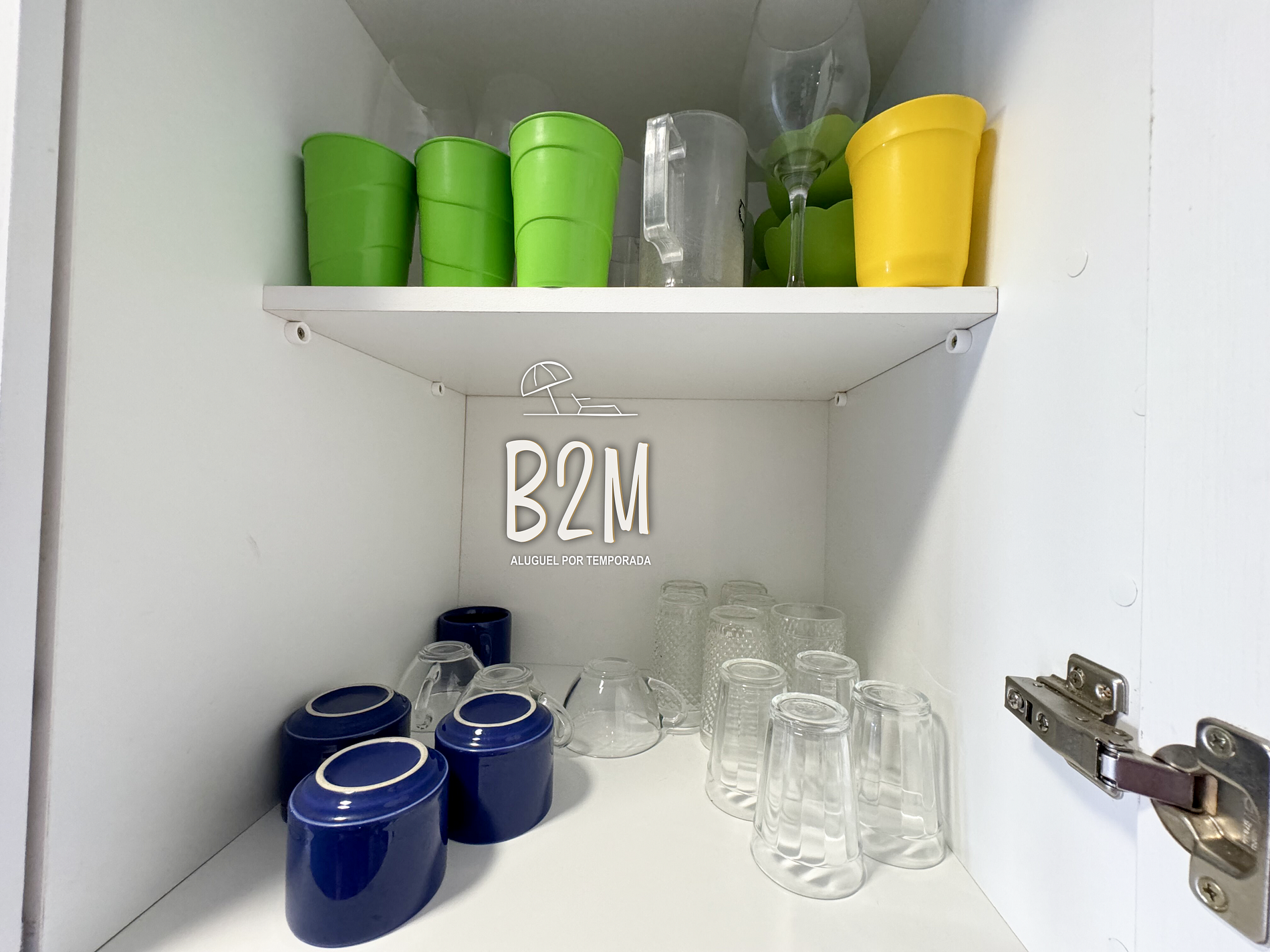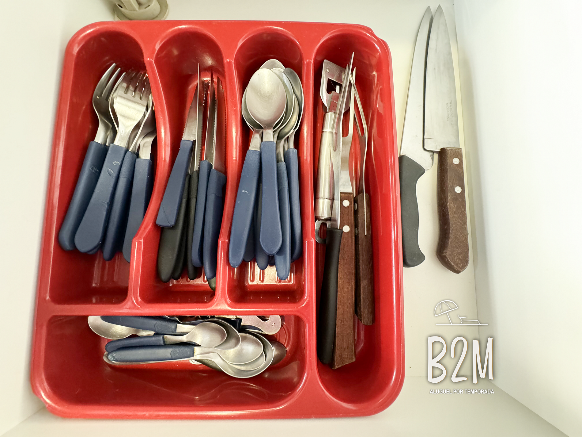geladeira, microondas, fogão, forno, panelas, talheres e utensílios para o preparado de refeições.