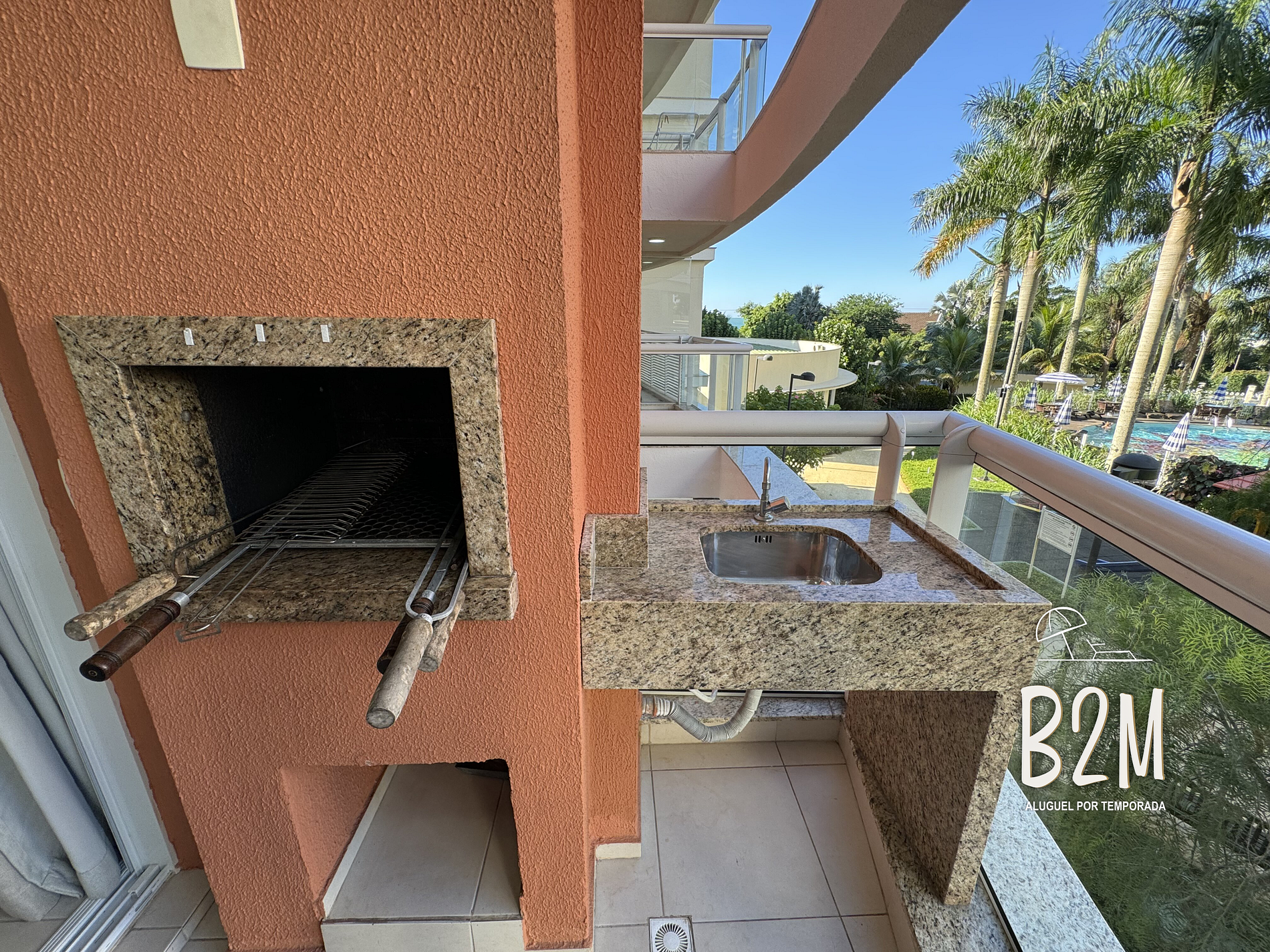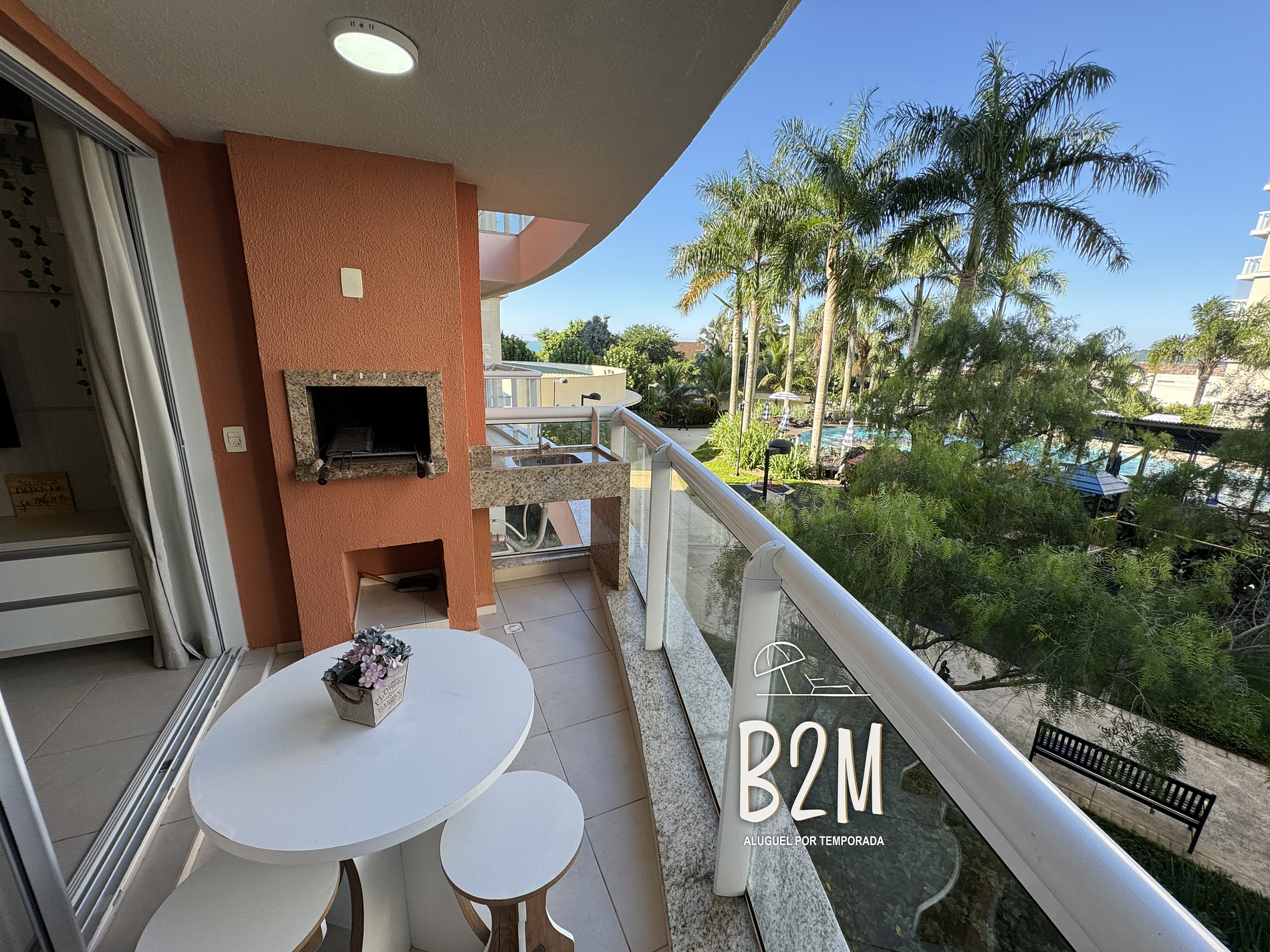 varanda com vista da piscina e do parquinho, cama casal, ar condicionado, armário, banheiro privativo com água quente
