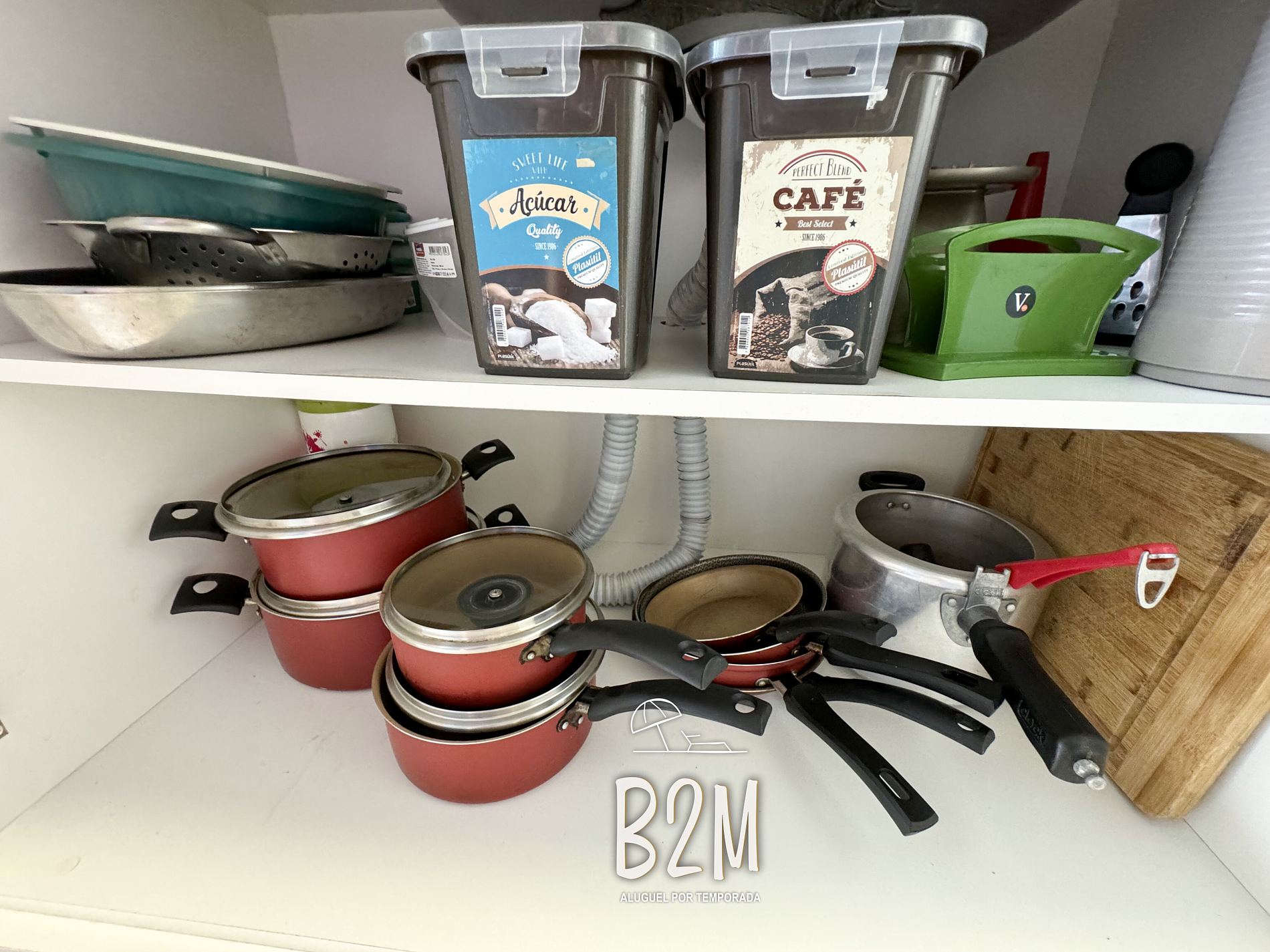 geladeira, microondas, fogão, forno, panelas, talheres e utensílios para o preparado de refeições.