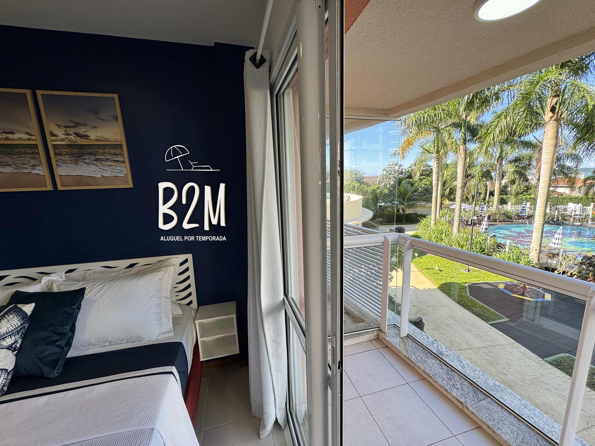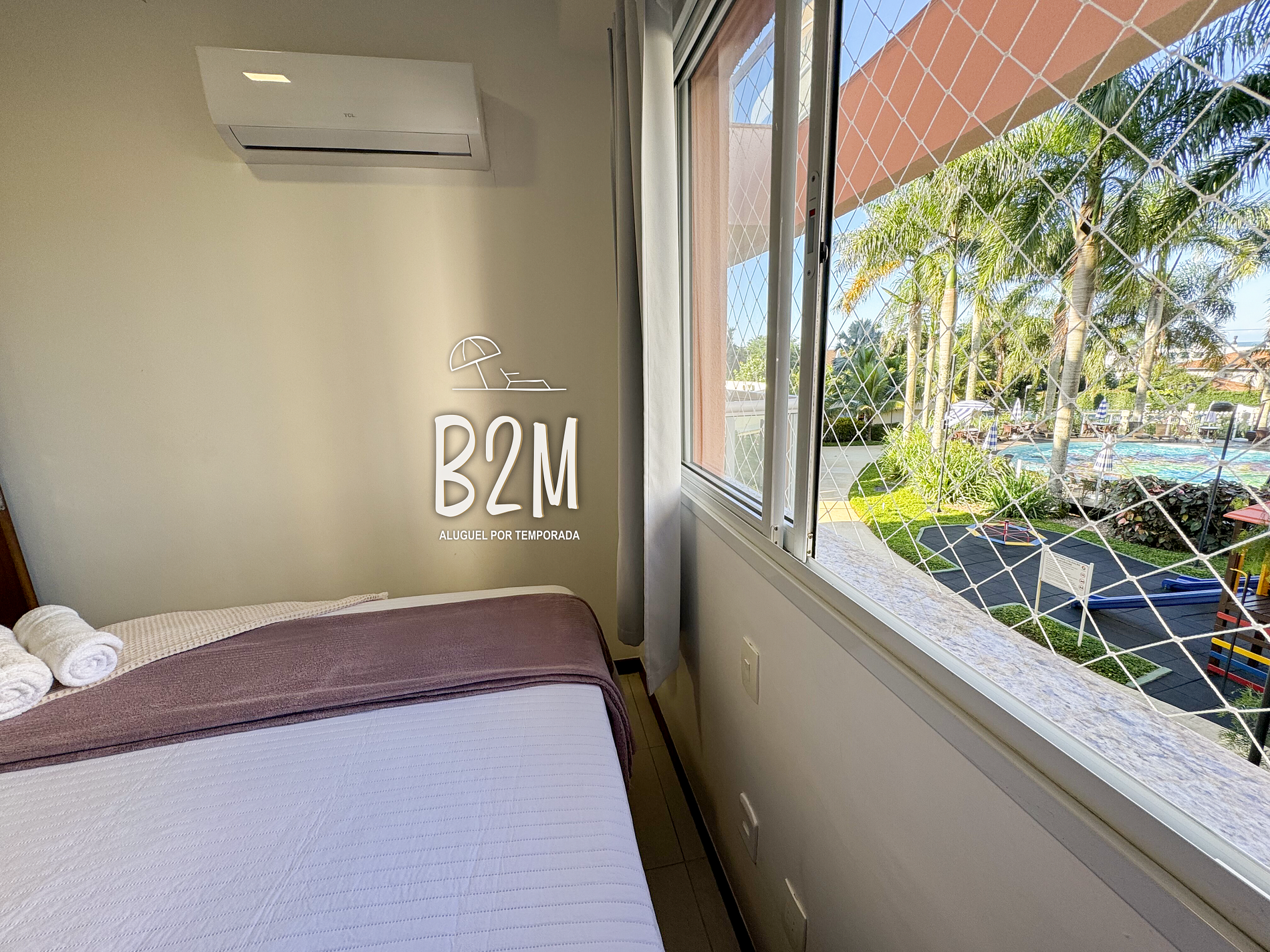 varanda com vista da piscina e do parquinho, cama casal, ar condicionado, armário, banheiro privativo com água quente