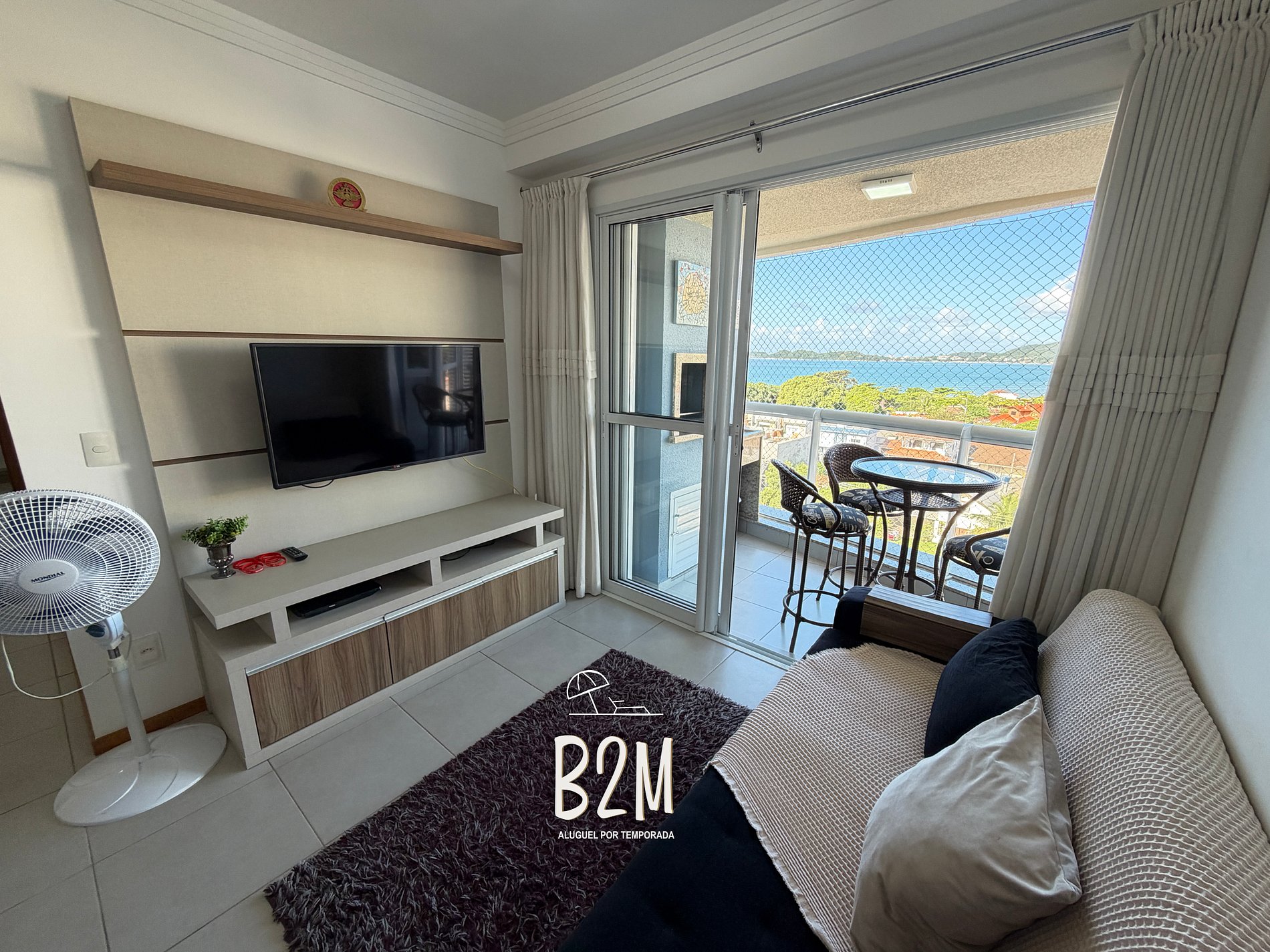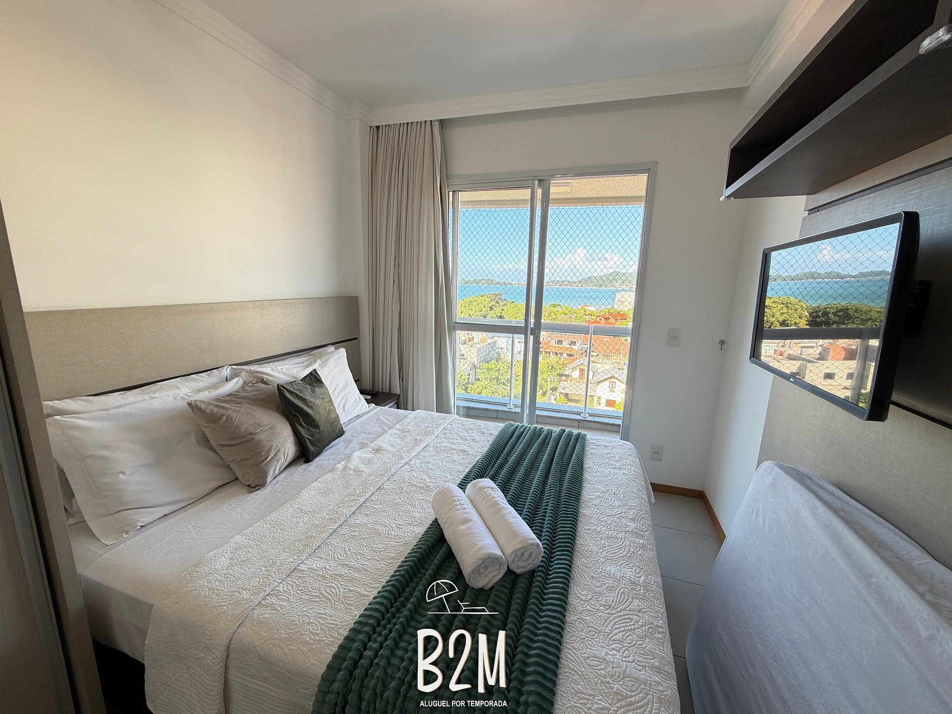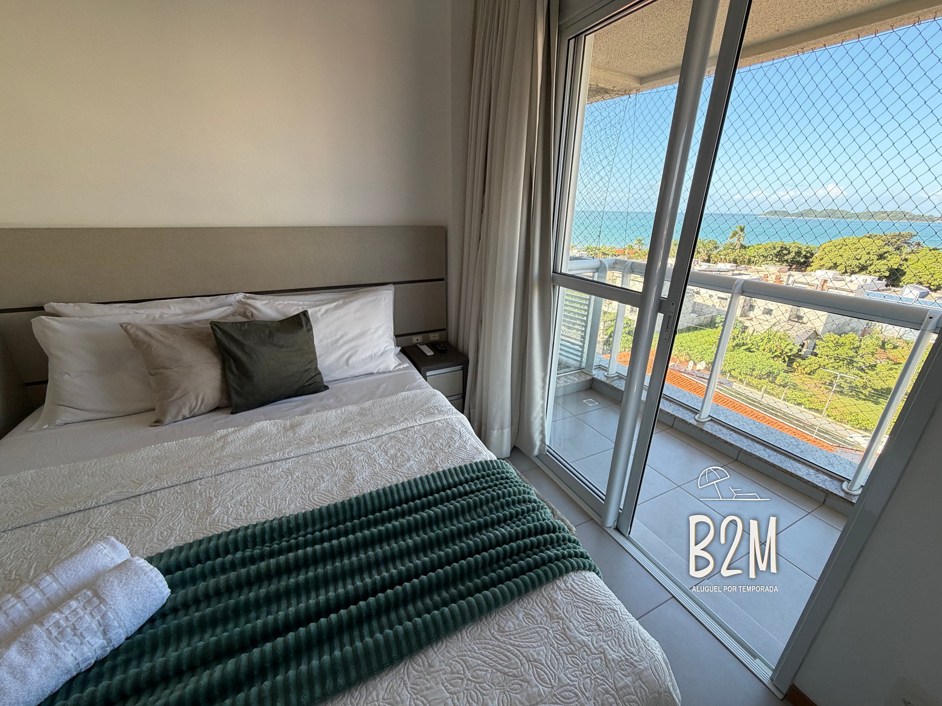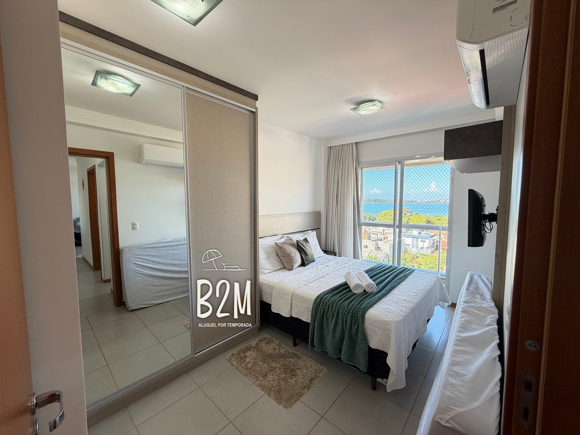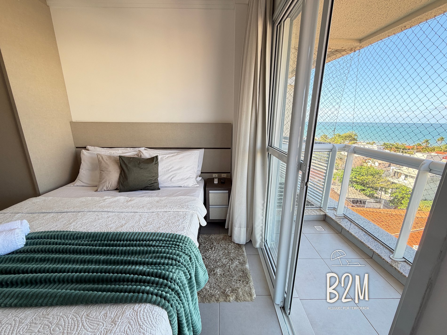 varanda com vista mar, cama queen, televisão, ar condicionado, armário, banheiro privativo com água quente